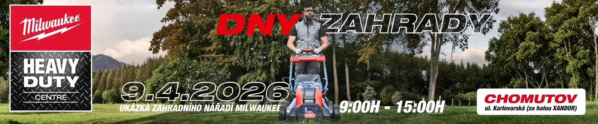 Zveme Vás na DNY ZAHRADY MILWAUKEE. Akce proběhne 9.4.2026 od 9:00h do 15:00h v Chomutově, ul. Karlovarská (za halou Xandor), před novým HEAVY DUTY CENTREM Milwaukee.