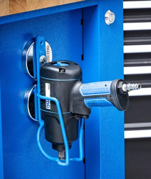 Držák který umožňuje rychlé uchycení, zavěšení nářadí na kovové povrchy a zvyšuje pořádek i dostupnost v dílně. Kompatibilní s většinou běžných vzduchových utahováků, vrtaček.