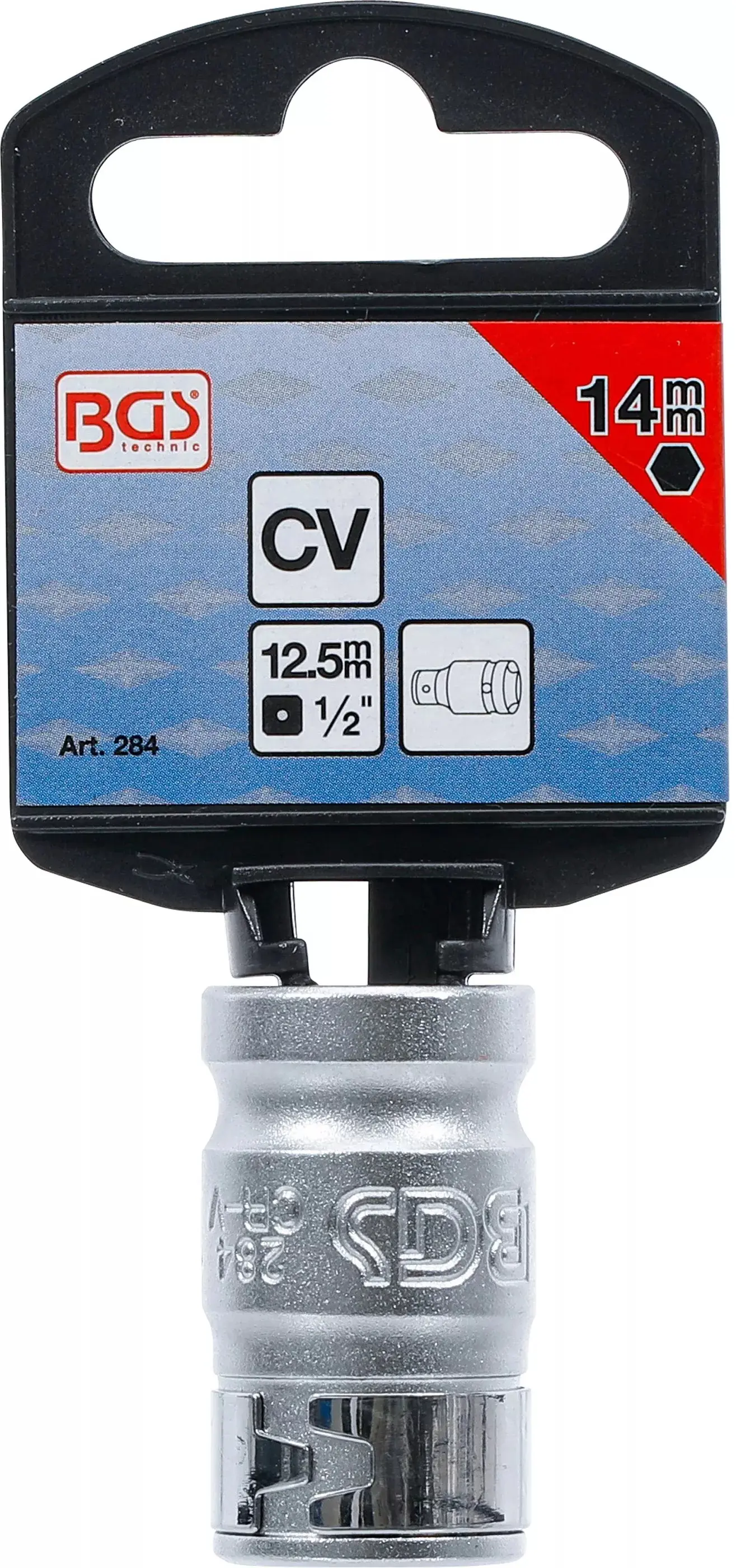 Adaptér vnitřní 1/2" BGS100284 s vnitřním šestihranem 14 mm a pojistnou kuličkou umožňuje bezpečné a přesné spojení nářadí při práci v dílně.