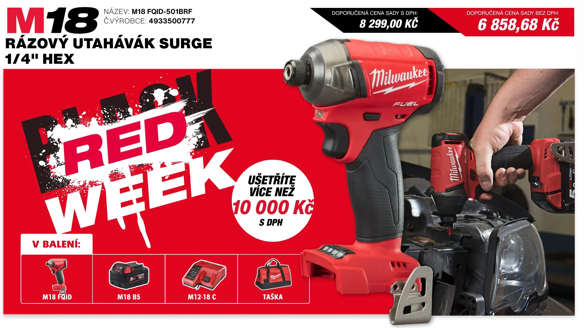 Aku 1/4" HEX rázový šroubovák/utahovák Milwaukee M18 FQID-501B, 50 Nm, aku M18 B5 + M12-18 C + taška, 4933500777 RED FRIDAY