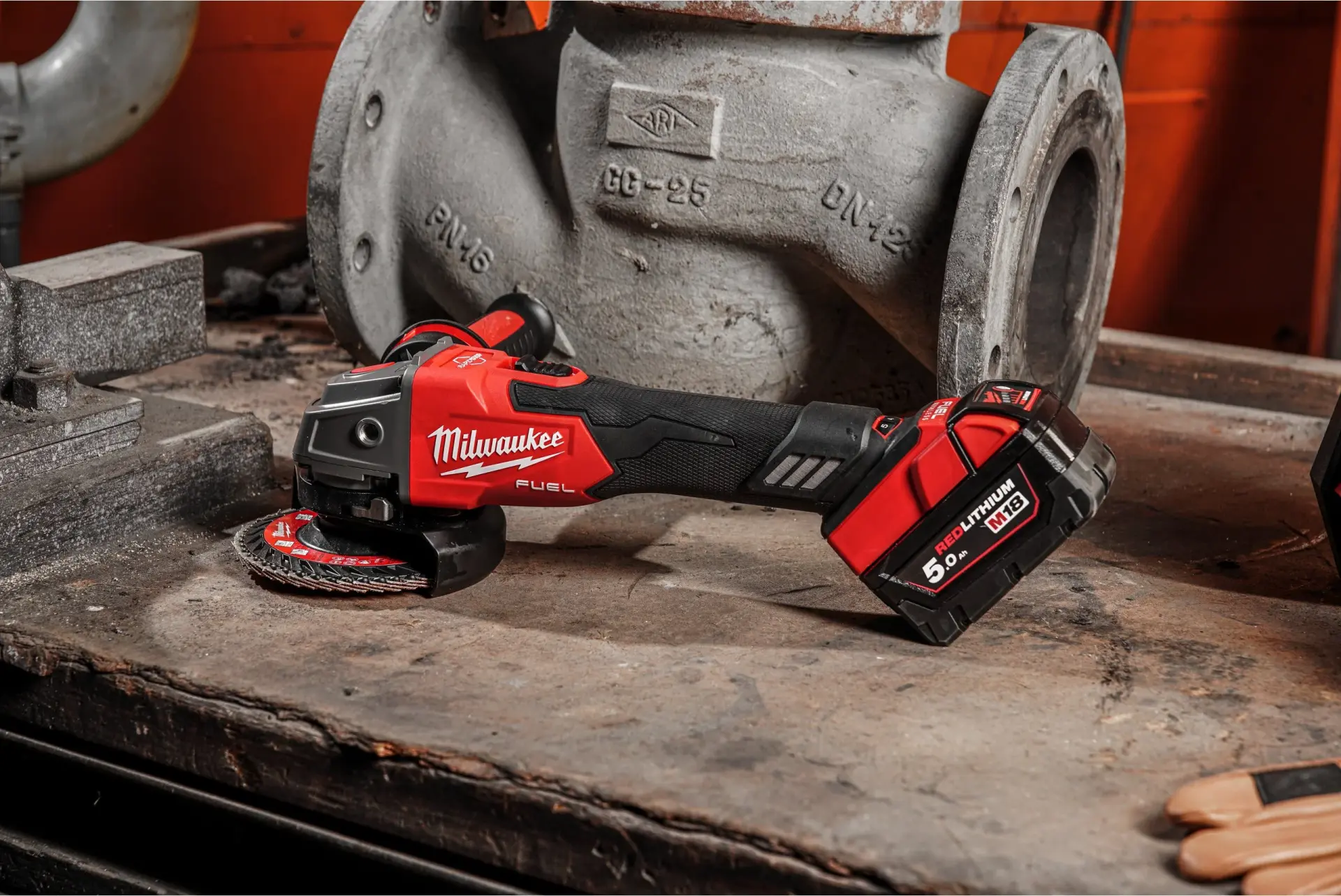 Aku úhlová bruska 125 mm (1200 W) Milwaukee M18 FSAGV125XB-0 s posuvným spínačem, brzdou a regulací otáček (bez aku) 4933499158 (MI4933499158)