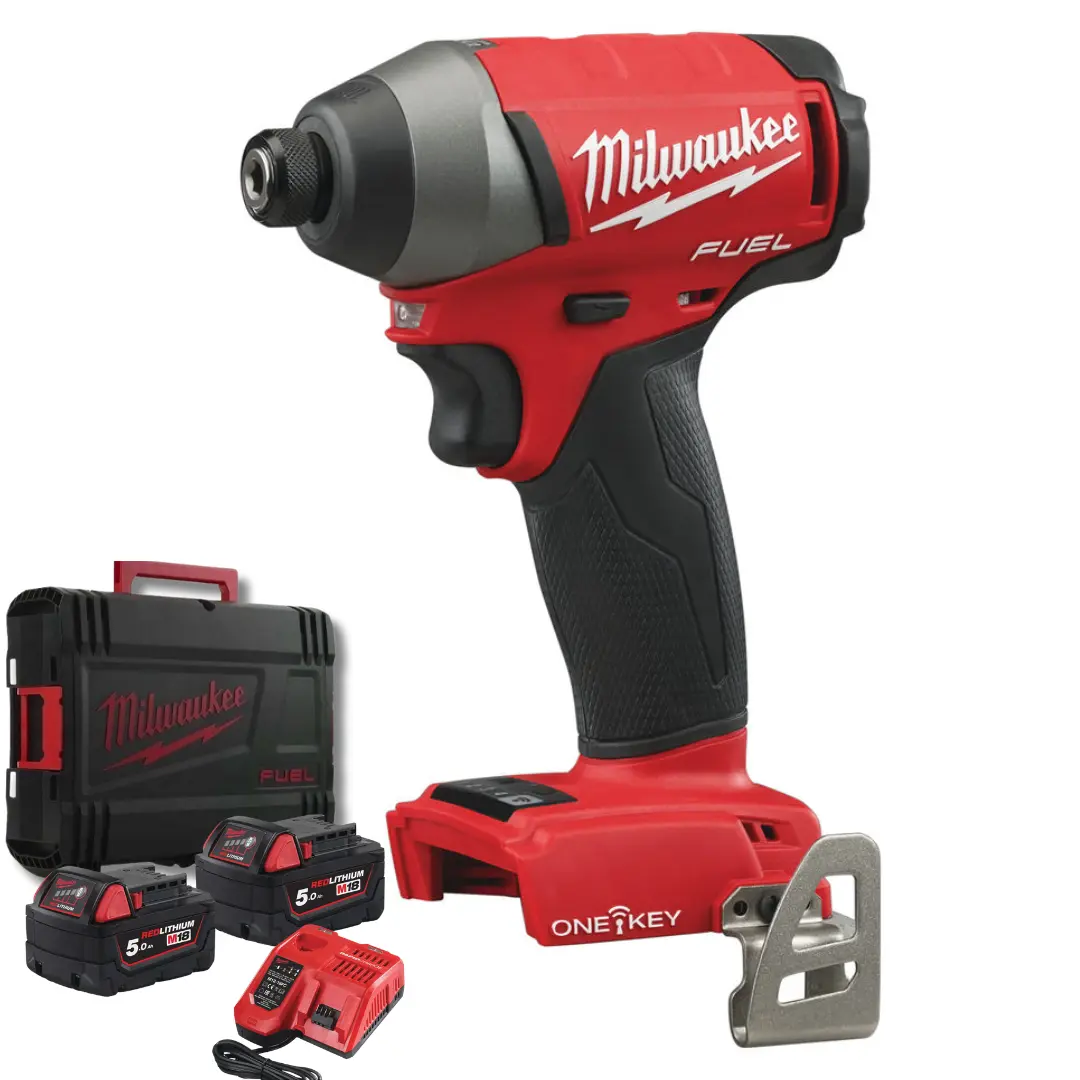 Akumulátorový rázový šroubovák Milwaukee M18 ONEID-502X, 2x akumulátor M18 B5 (18V / 5,0 Ah), aku nabíječka M12-18 FC a s kufrem.