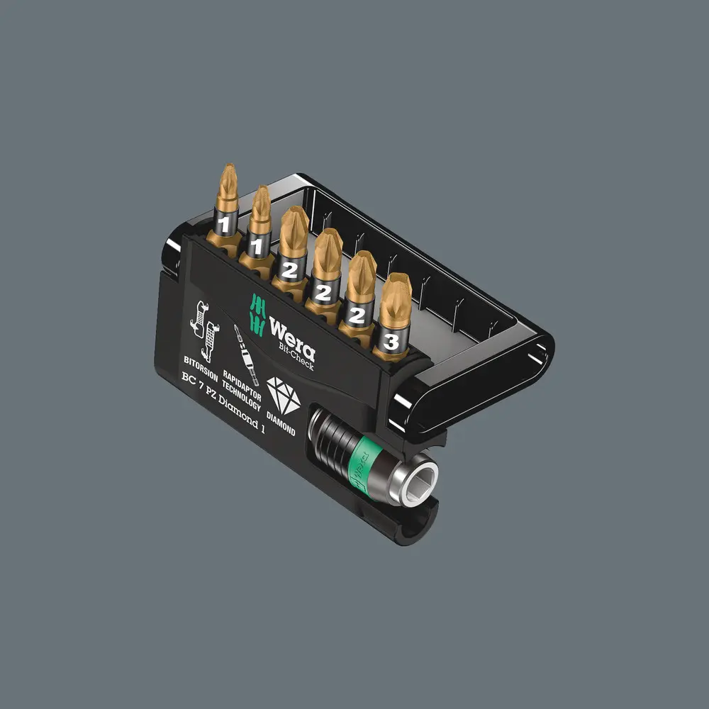 Kvalitní bity s miniaturními diamantovými částicemi na špičce bitu. Tyto částice zajišťují bezpečné uchycení v šroubu, redukují potřebný přítlak a snižují nebezpečí sesmeknutí. S torzní zónou, do které je při zátěžových špičkách odvedena kinetická energie. S měkčí torzní zónou pro zabránění deformace špičky bitu při vysokém zatížení. Díky tomu výrazné prodloužení životnosti produktu. Šestihran 1/4", vhodný pro držáky podle DIN ISO 1173-D 6,3. Torzní bity včetně identifikátoru nářadí Wera "Take it easy".