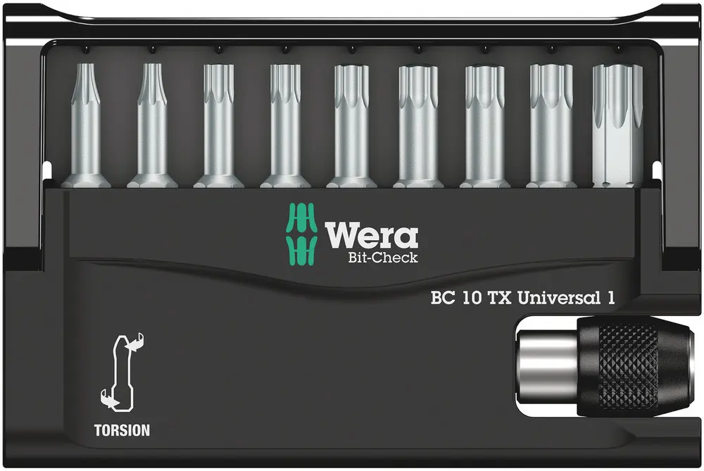 Robustní krabička Bit-Check od firmy Wera. Krabičky Bit-Check umožňují rychlý přehled o dostupném nářadí. Nepotřebné bity se jednoduše vrátí do krabičky, aby se neztratily. Jednoduché přemístění, např. v kapse u košile. Včetně univerzálního držáku s rychloupínací hlavou. Pro upnutí bitů s připojovacím rozměrem vnějšího šestihranu 1/4" podle DIN ISO 1173-C 6,3. Pro upnutí do šroubovacího zařízení nebo pro použití ve sklíčidle elektronické vrtačky. Včetně houževnatých bitů TORX®, pro univerzální použití.