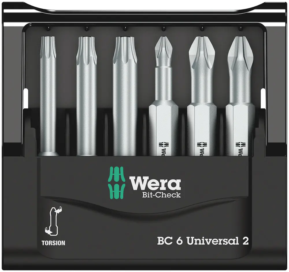 6 bitů Wera s délkou 50 mm uspořádaných přehledně na minimální ploše v praktické krabičce Bit-Check. Houževnaté bity jsou vhodné pro univerzální použití. U torzních bitů (TZ) jsou navíc špičky utahovacích momentů tlumeny v torzní zóně. Předchází se tak předčasnému opotřebení, zvyšuje se životnost bitu.