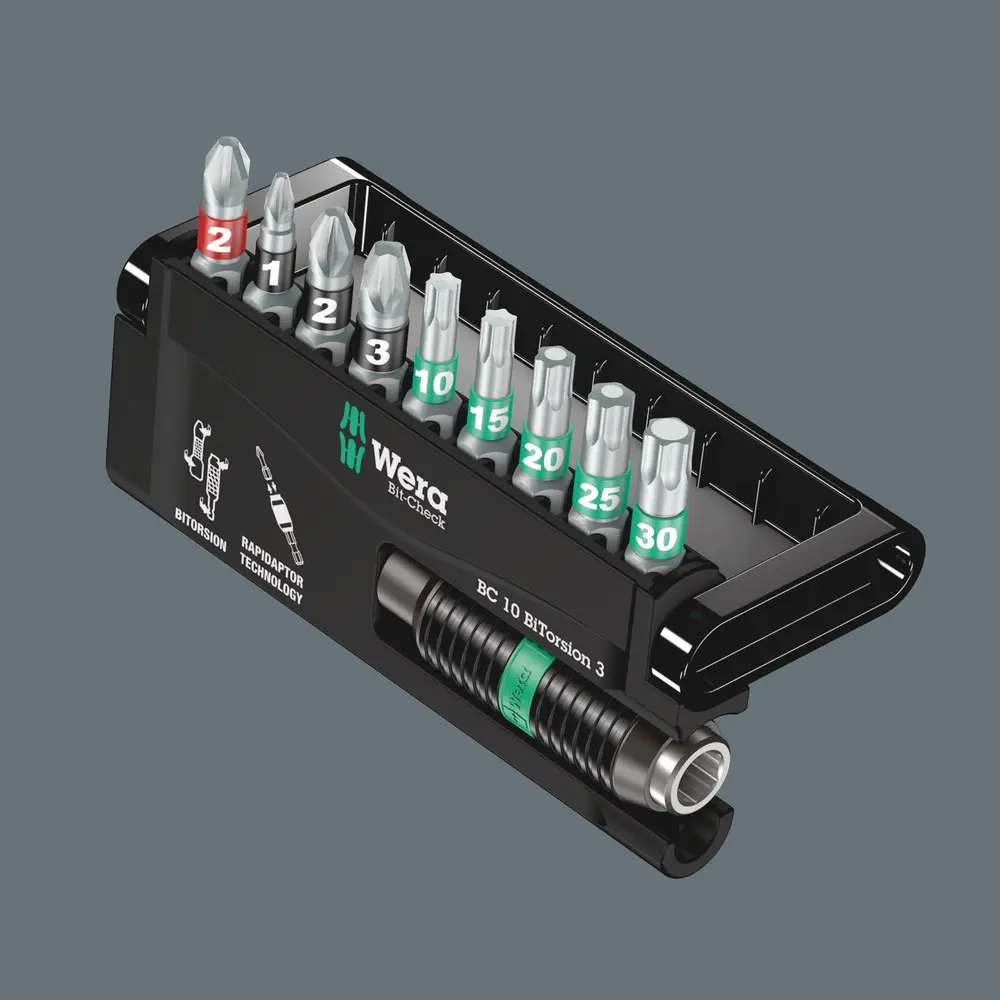 Robustní krabička Bit-Check od firmy Wera. Krabičky Bit-Check umožňují rychlý přehled o dostupném nářadí. Nepotřebné bity se jednoduše vrátí do krabičky, aby se neztratily. Jednoduché přemístění, např. v kapse u košile. Velmi tvrdé bity. Torzní bity s elastickou torzní zónou, do které je při zátěžových špičkách odvedena kinetická energie. S měkčí torzní zónou pro zabránění deformace špičky bitu při vysokém zatížení. Díky tomu výrazné prodloužení životnosti produktu. S vhodným držákem nejlepší životnost. Vybavení technologií Rapidaptor, která umožňuje upnutí bitů i bez manipulace s pouzdrem. Vyjmutí bitu se provádí jednoduchým posunutím směrem dopředu - pro bleskovou výměnu bitů, také jen jednou rukou. Pro upnutí bitů s připojovacím rozměrem vnějšího šestihranu 1/4" podle DIN ISO 1173-C 6,3 a E 6,3. Pro upnutí do šroubovacího zařízení nebo pro použití ve sklíčidle elektronické vrtačky.