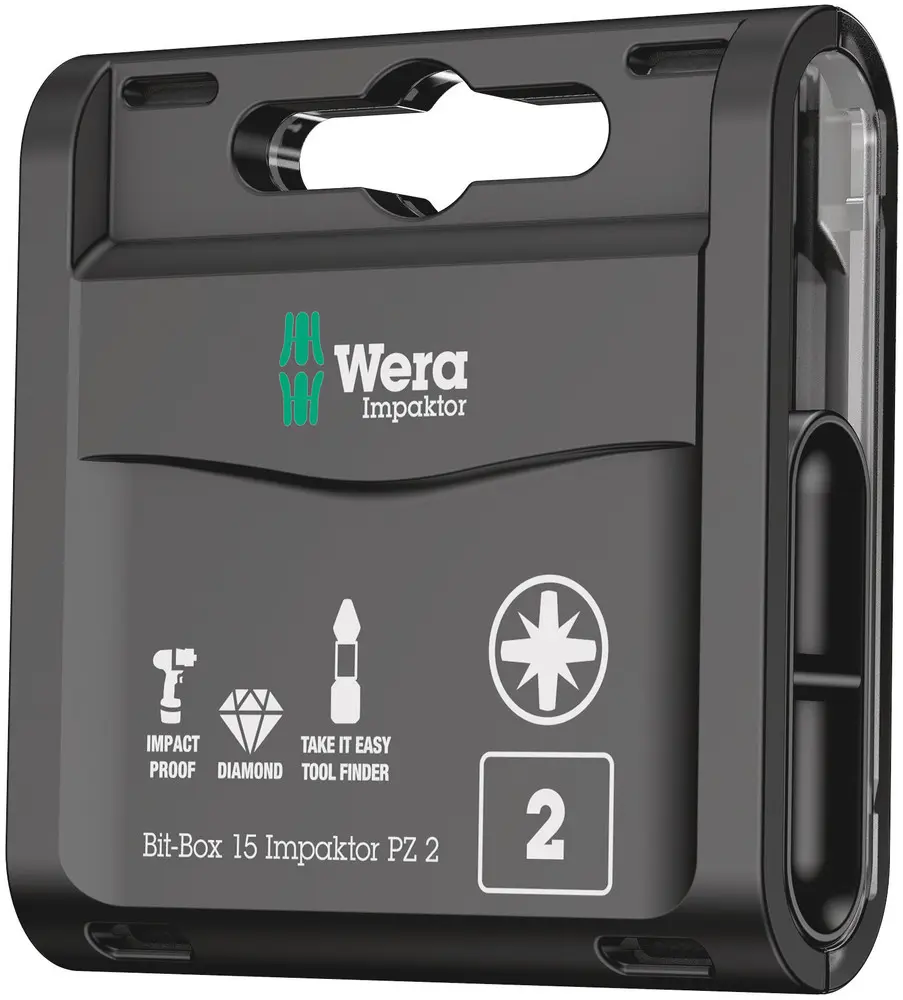 Kvalitní bity na šrouby Pozidriv v praktickém boxu. Technologie Impaktor zajišťuje nadprůměrnou životnost i při extrémních požadavcích. Vyšší třecí odpor díky hrubé vrstvě diamantových částic na špičce bitu zabraňuje vyklouznutí ze šroubu. Zvlášť vhodné pro použití s běžnými impaktními/rázovými utahováky. Šestihran 1/4", vhodný pro držáky podle DIN ISO 1173-D 6,3. S identifikátorem nářadí "Take it easy": Barevné označení podle profilů a značky velikosti.
