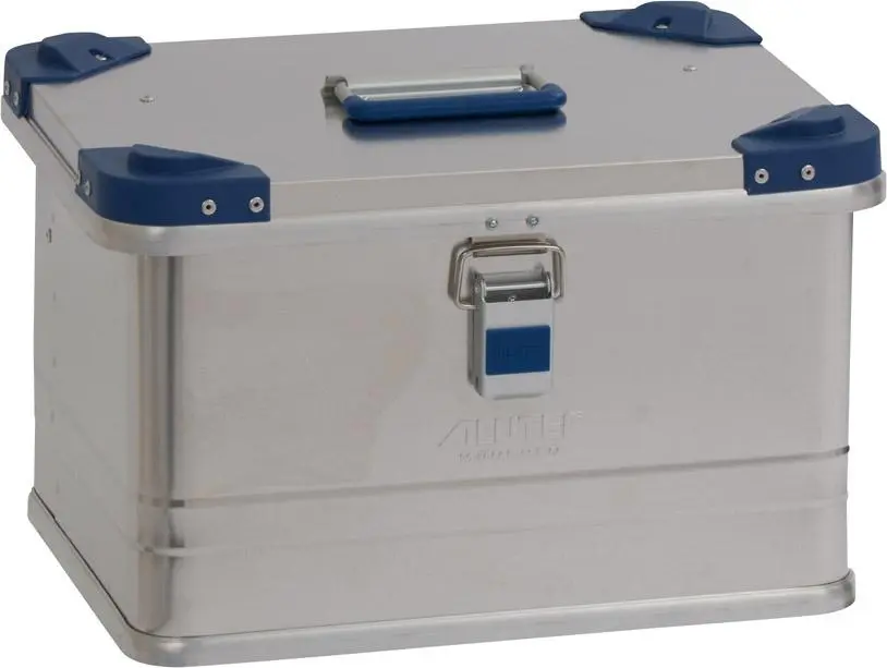 Provedení: Z 1 mm hliníku, s pryžovým těsněním po obvodu víka, odolný vůči stříkající vodě a povětrnostním vlivům. Se 2 bočními velkorozměrovými držadly pro snadné přenášení. Se silnými, robustními závěsy a popruhy pro aretaci. Skrze speciální rohy kufru a profily dna, snadno stohovatelné. Zamykatelný skrze 2 poklopové uzávěry a přídavnou funkcí zamykání visacím zámkem (není v objemu dodávky). Základní rozměry jsou sladěné s rozměrem palety.