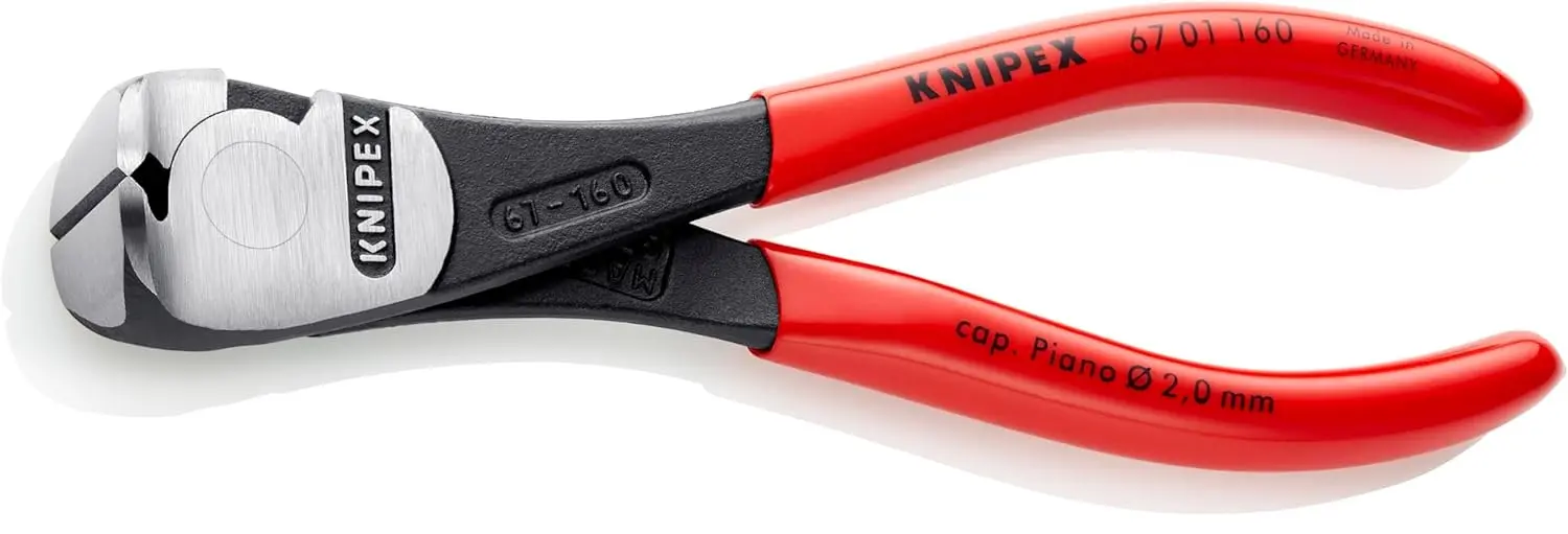 Čelní silové štípací kleště KNIPEX 67 01 160 s leštěnou hlavou a plastovými návleky umožňují přesné štípání drátů díky délce 160 mm a robustní konstrukci. Ergonomické rukojeti zajišťují pevný úchop při práci v dílně i domácnosti.