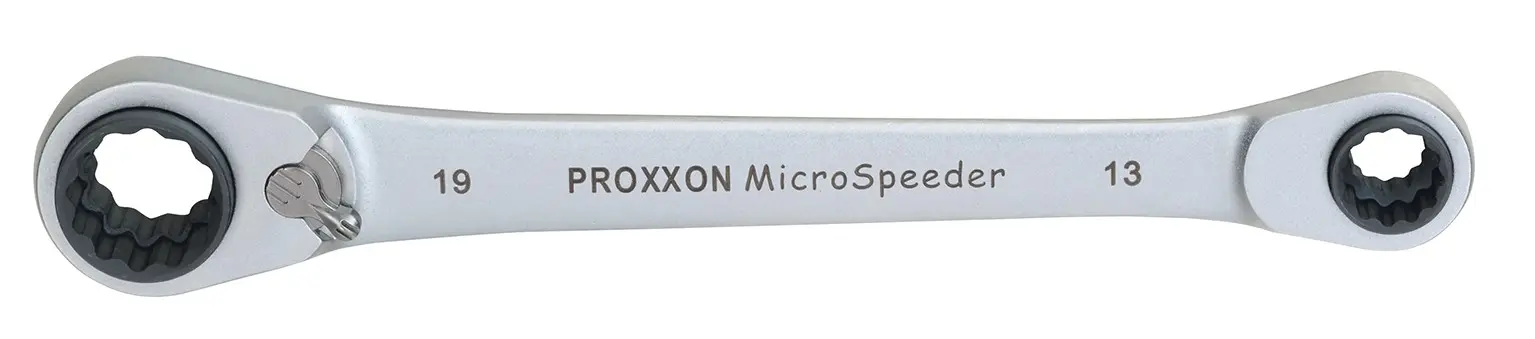 Kombinovaný klíč MicroSpeeder nabízí čtyři velikosti v jednom nástroji (10-13 / 17-19 mm) a ráčnový mechanismus pro rychlejší práci v těžko přístupných místech. Robustní konstrukce zajišťuje dlouhou životnost a spolehlivost při montážních i opraváren