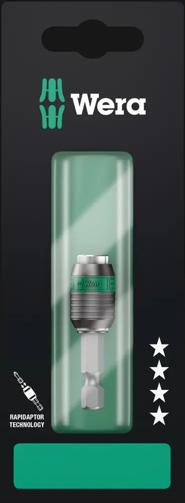 Univerzální držák Rapidaptor pro bity s připojovacím rozměrem vnějšího šestihranu 1/4" podle DIN ISO 1173-C 6,3 a E 6,3 (ISO 1173). Rapidaptor umožňuje upnutí bitů i bez manipulace s pouzdrem. Vyjmutí bitu se provádí jednoduchým posunutím směrem dopředu - pro bleskovou výměnu bitů, také jen jednou rukou. Pouzdro z nerezové oceli pro mimořádnou ochranu proti korozi. Silný permanentní magnet drží bity velmi pevně. Šestihran 1/4", vhodný pro šroubovací zařízení s upnutím podle DIN ISO 1173-F 6,3.