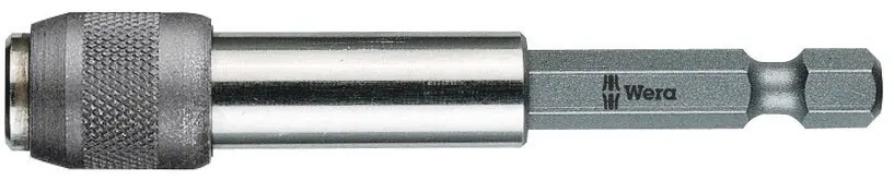 Univerzální držák pro upnutí bitů s připojovacím rozměrem vnějšího šestihranu 1/4" podle DIN ISO 1173-C 6,3. S rychloupínací hlavou pro rychlou výměnu bitů. Silný permanentní magnet drží bity velmi pevně. Šestihran 1/4", vhodný pro šroubovací zařízení s upnutím podle DIN ISO 1173-F 6,3.