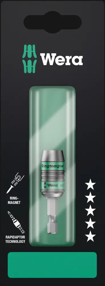Univerzální držák Rapidaptor pro bity s připojovacím rozměrem vnějšího šestihranu 1/4" podle DIN ISO 1173-C 6,3 a E 6,3 (ISO 1173). Volnoběžné magnetické pouzdro s plovoucím uložením pevně přidržuje i dlouhé a těžké šrouby. Rapidaptor umožňuje upnutí bitů i bez manipulace s pouzdrem. Vyjmutí bitu se provádí jednoduchým posunutím směrem dopředu - pro bleskovou výměnu bitů, také jen jednou rukou. Šestihran 1/4", vhodný pro šroubovací zařízení s upnutím podle DIN ISO 1173-F 6,3.