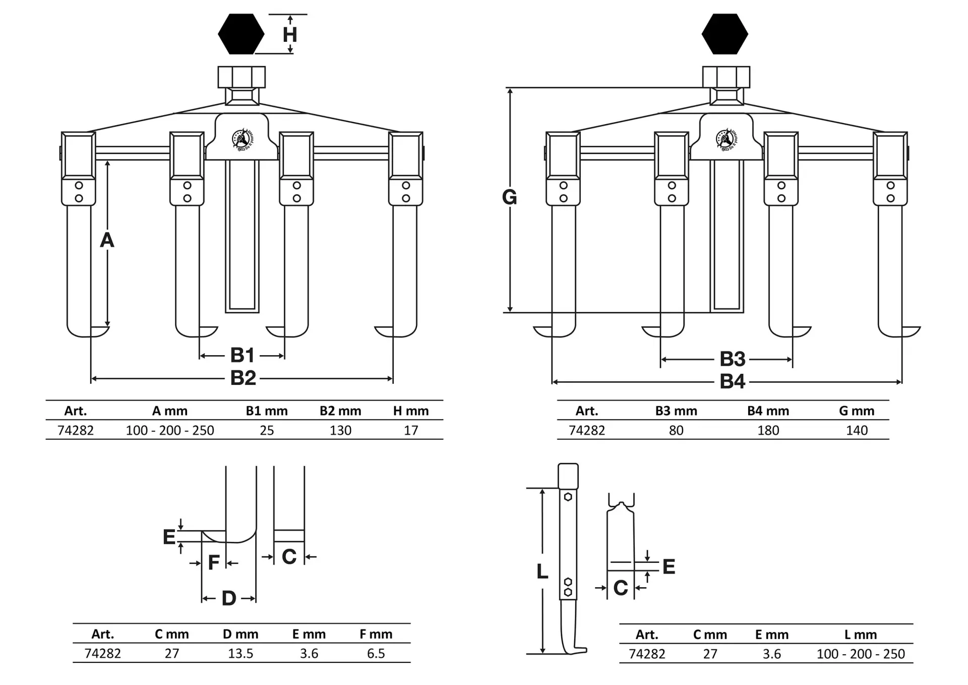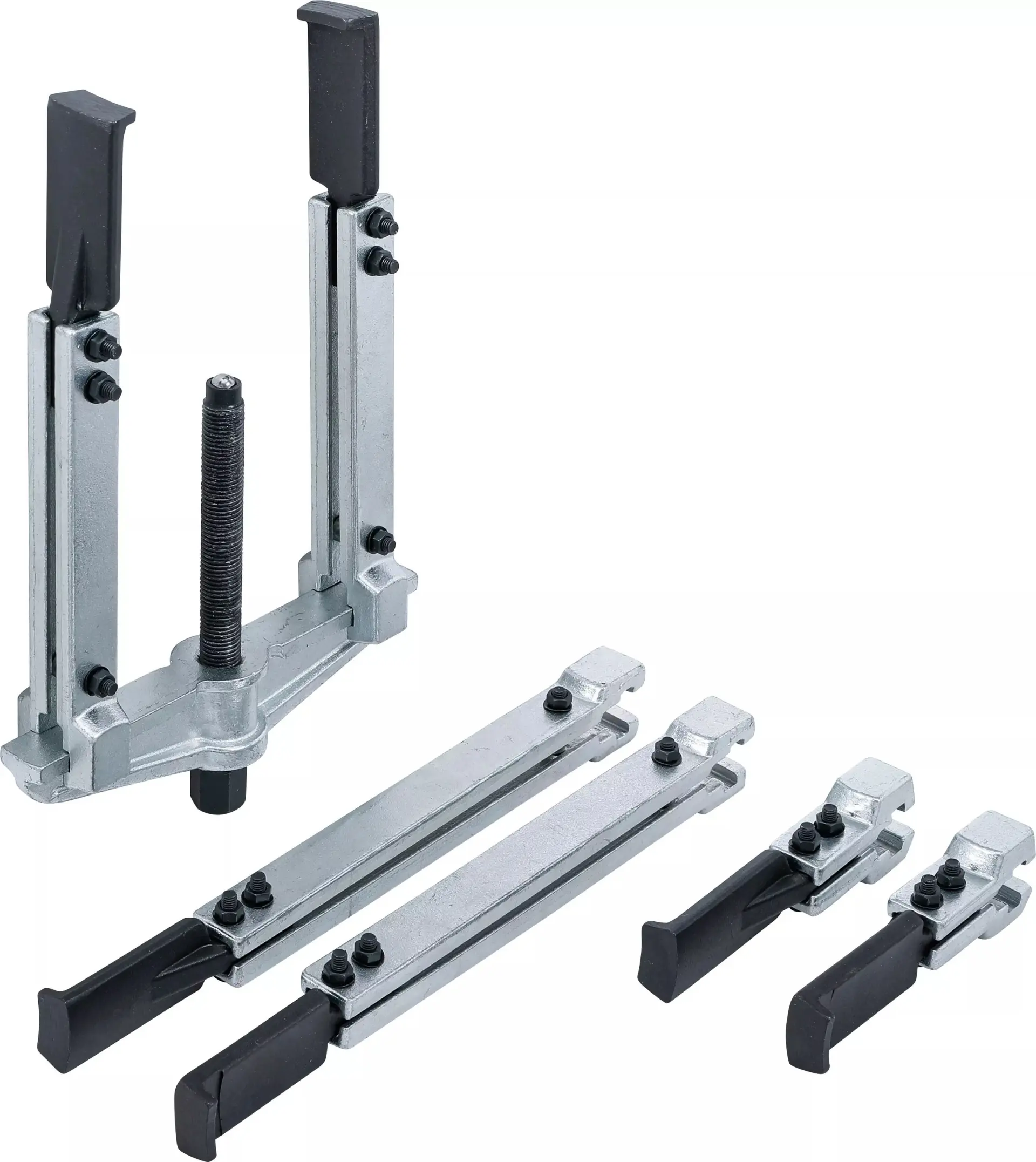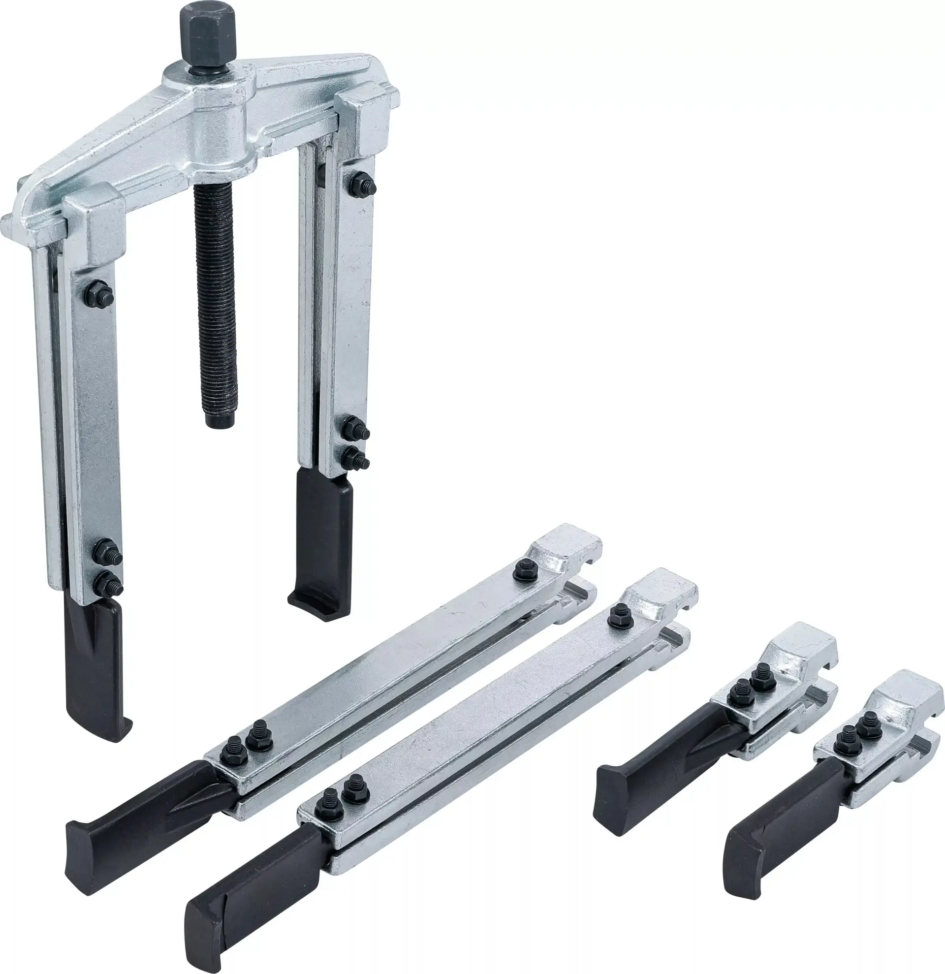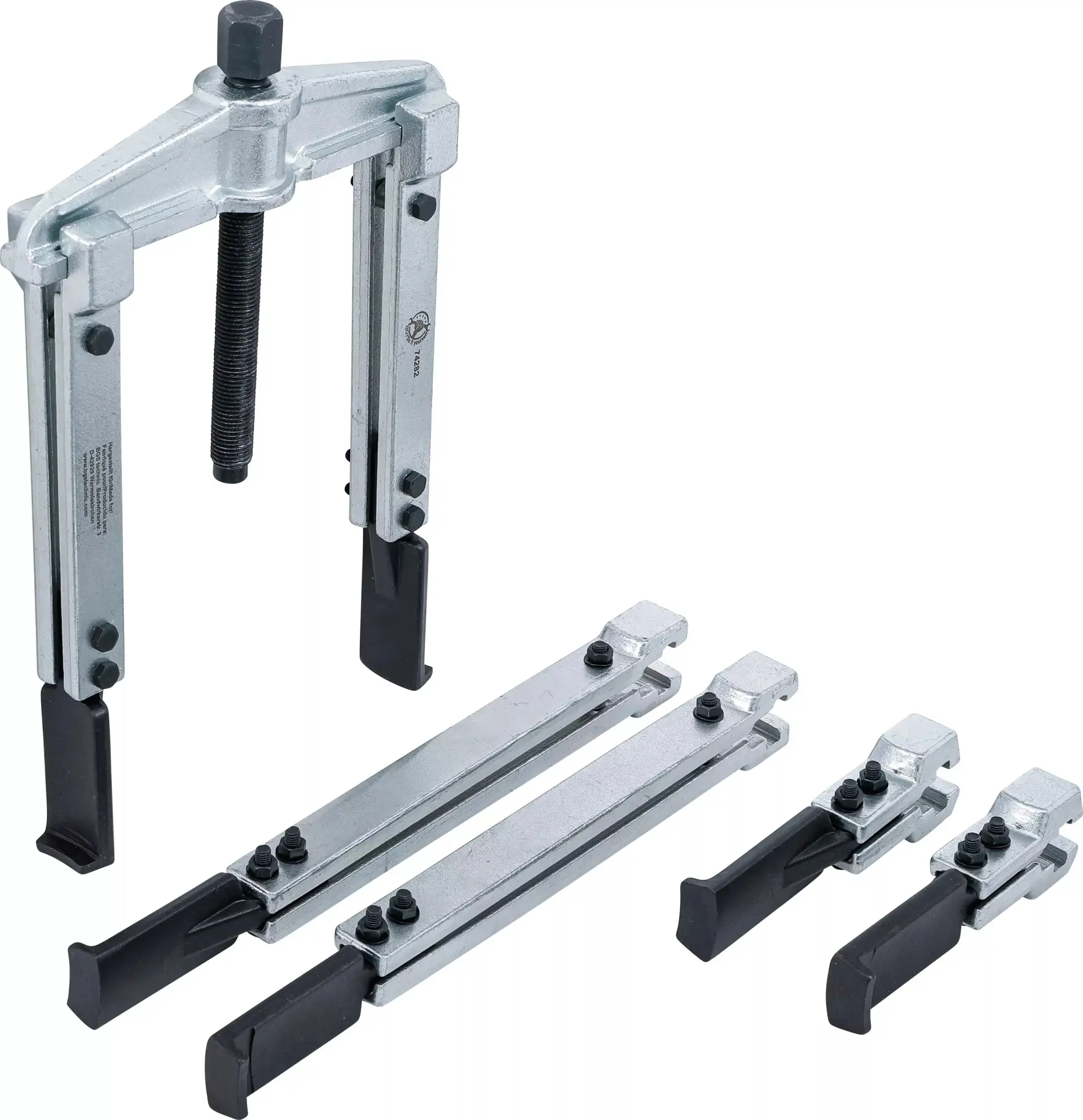 Sada dvouramenných stahováků BGS1074282 obsahuje osm kusů s rozsahem 25 až 180 mm, vhodných pro demontáž ložisek, ozubených kol a řemenic. Robustní konstrukce zajišťuje dlouhou životnost při častém používání v dílně.