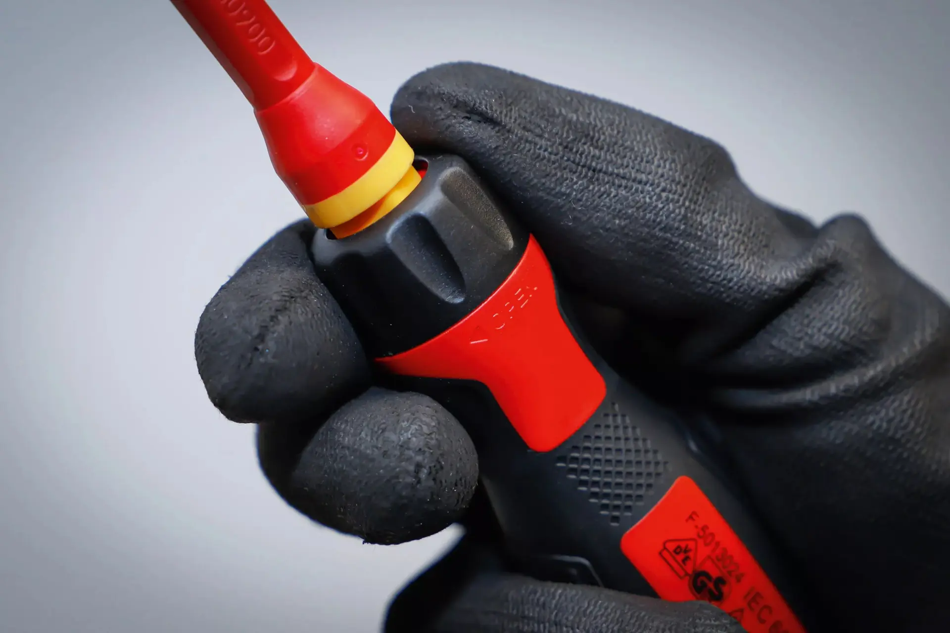 • 1 rukojeť VDE s upnutím pro výměnné čepele, s dvousložkovou rukojetí (červená/žlutá)