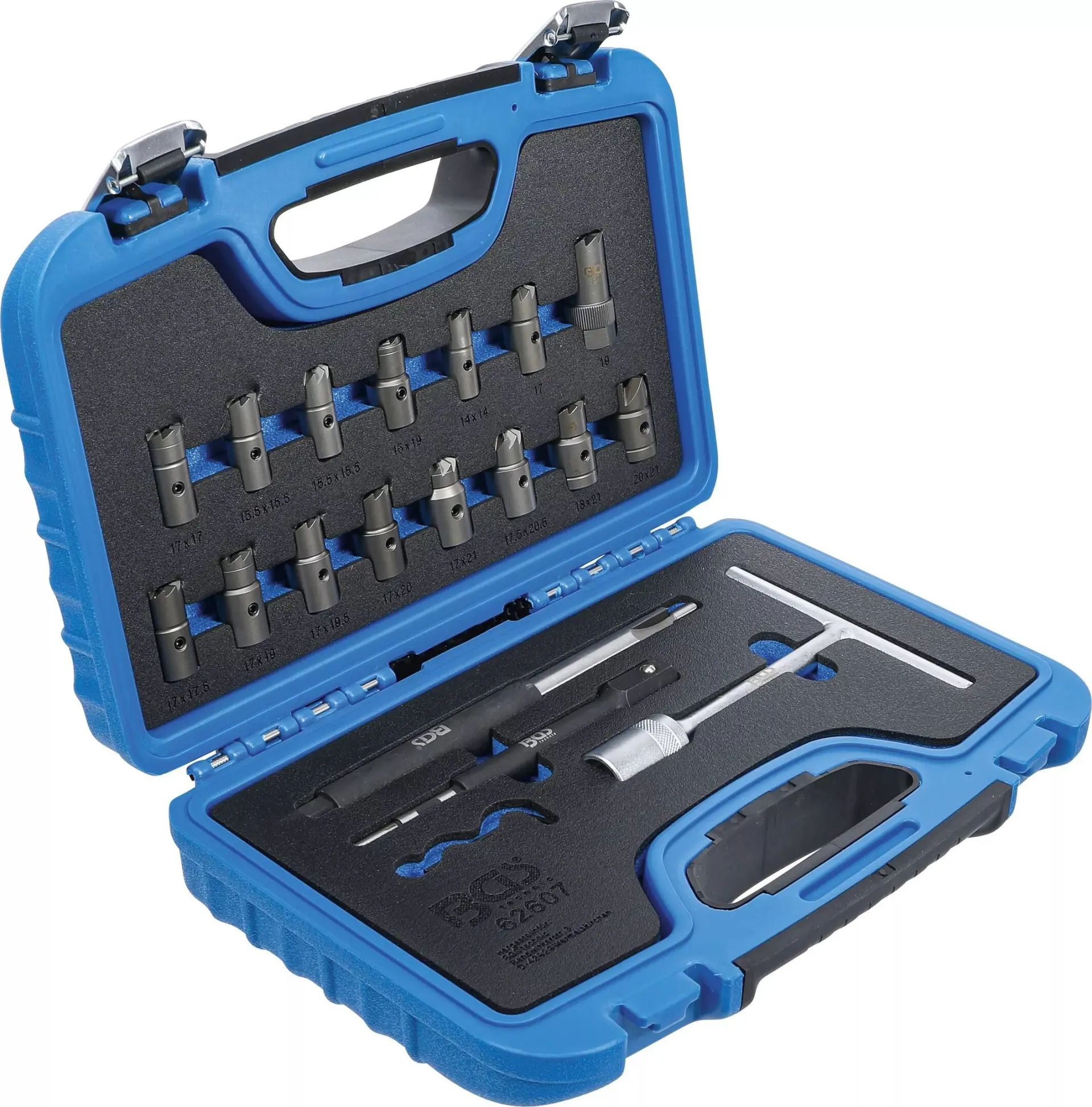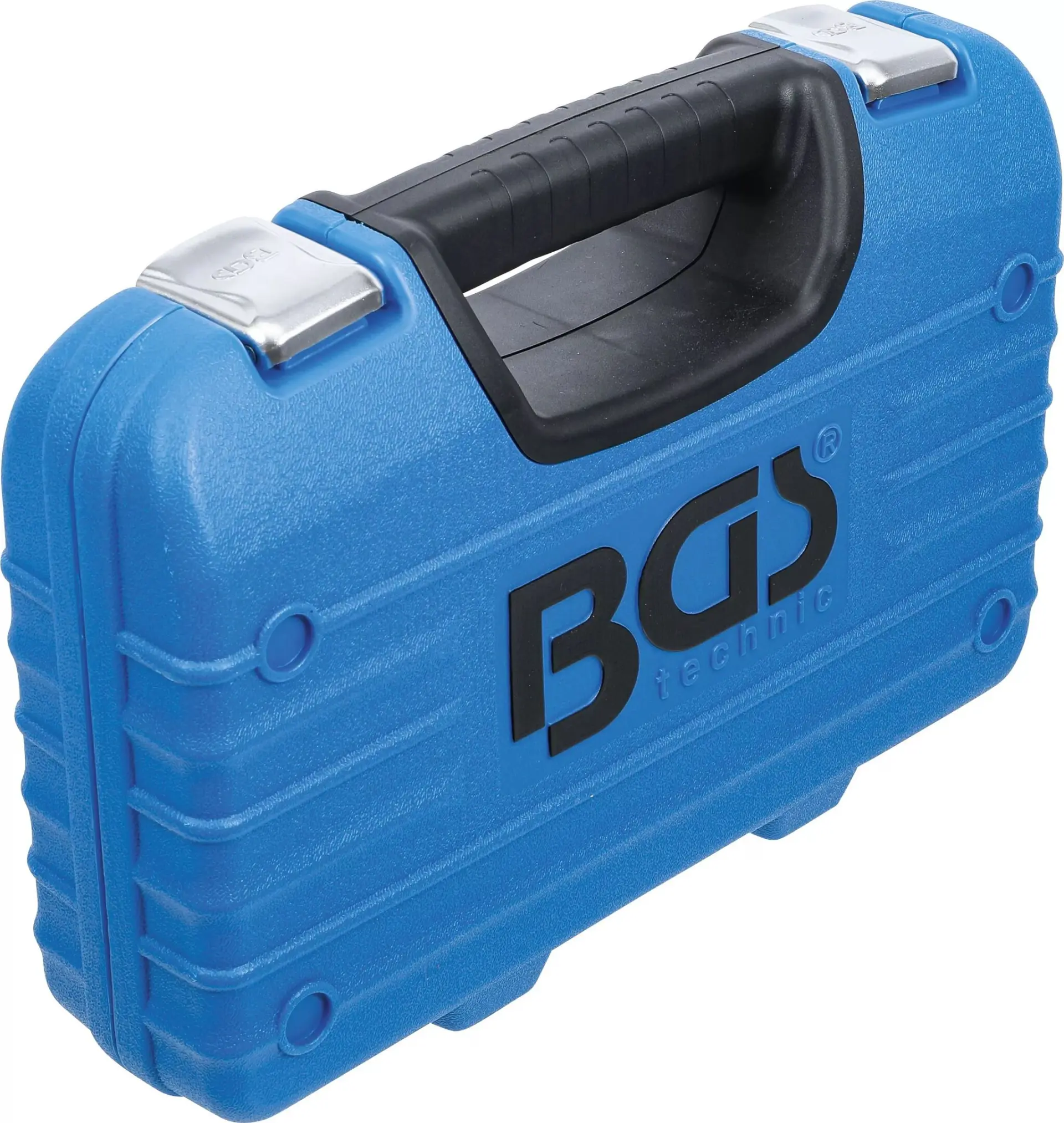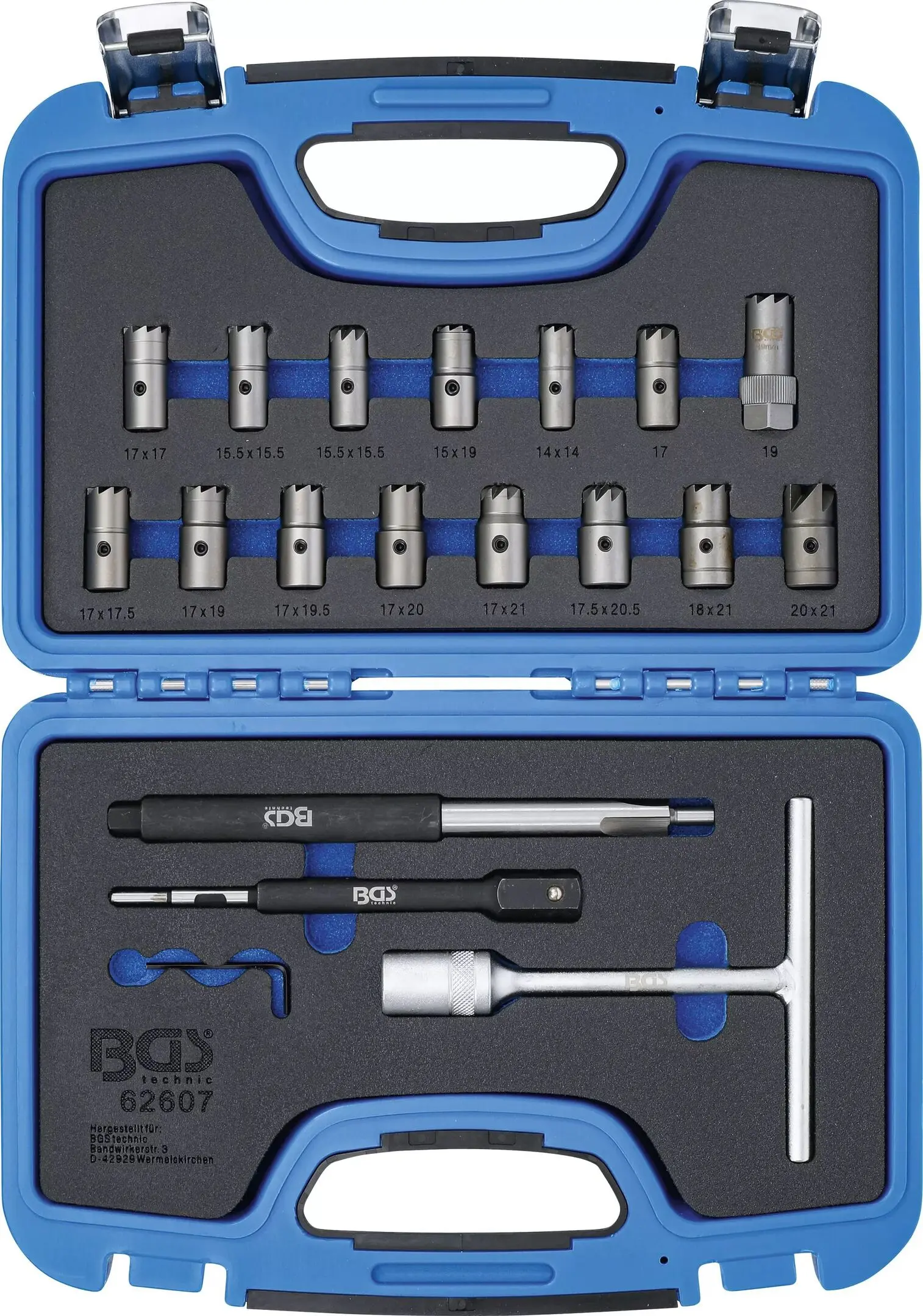 Sada fréz na sedla vstřikovačů BGS1062607 obsahuje 19 dílů pro přesné opracování sedel vstřikovačů v dieselových motorech, vhodná pro různé automobilové značky. Robustní kufřík usnadňuje přenášení i organizaci jednotlivých nástrojů.