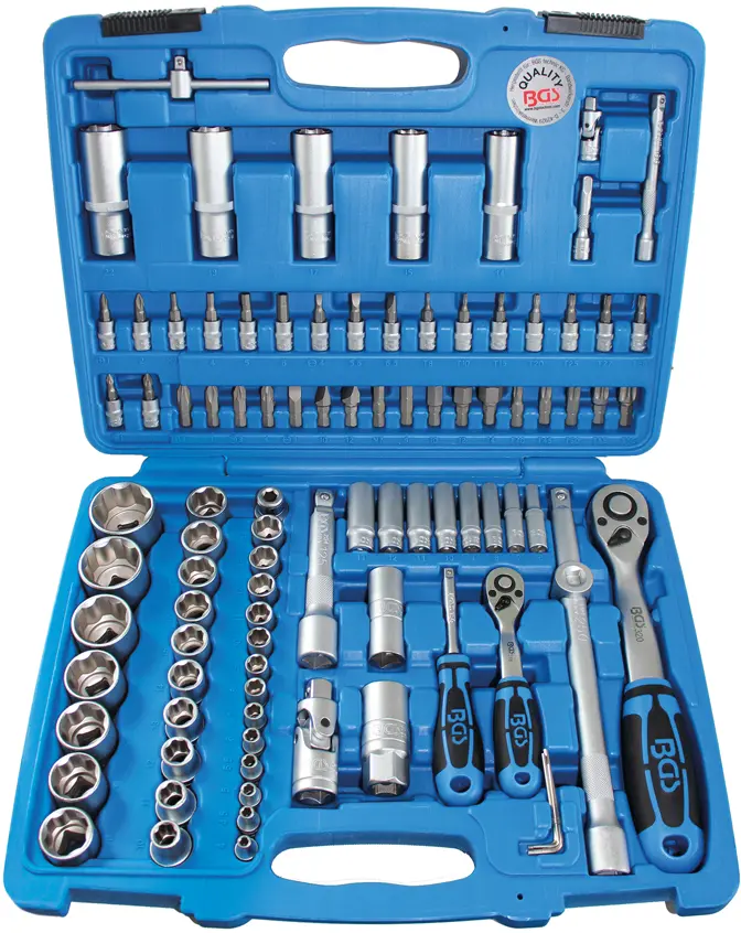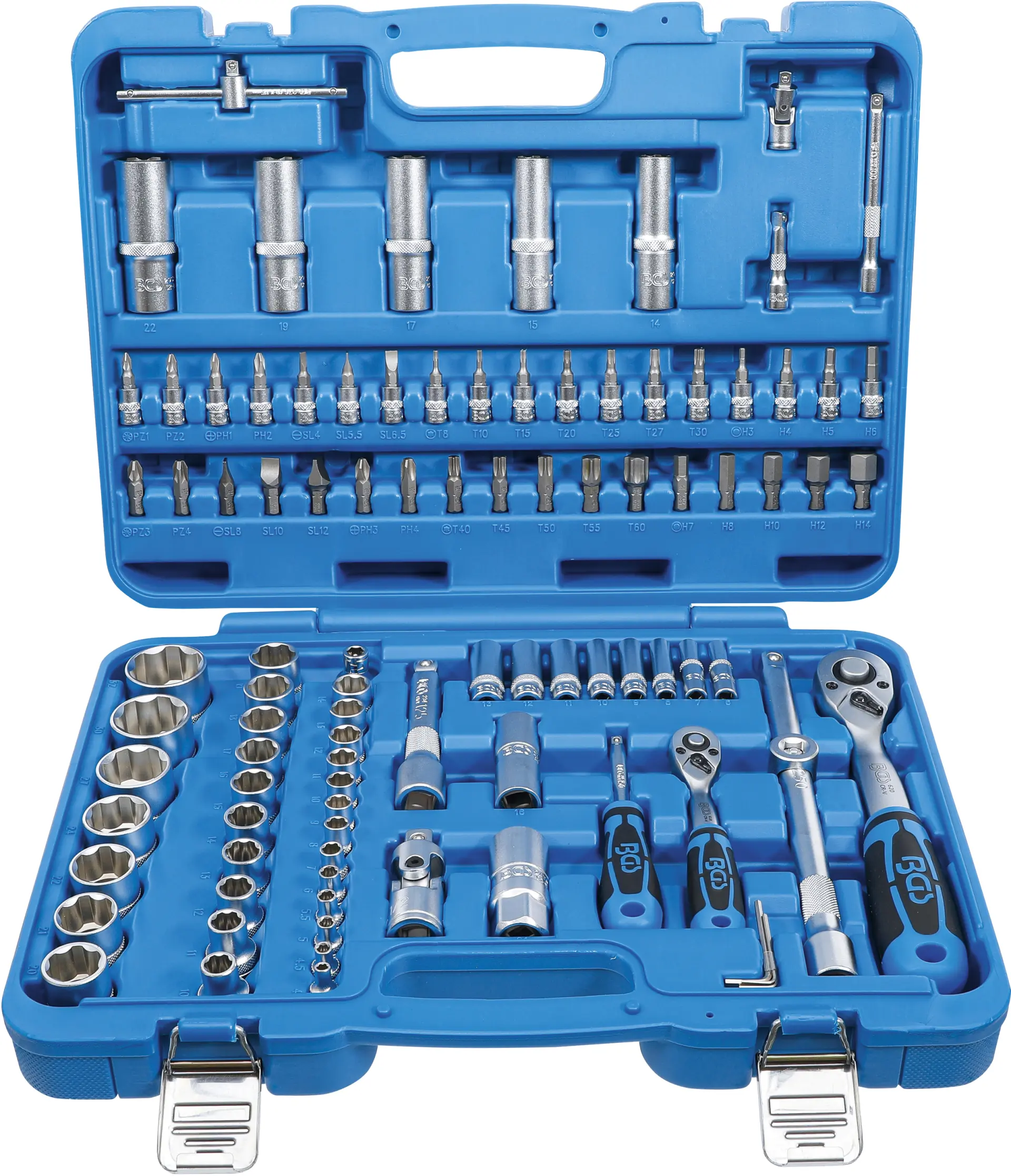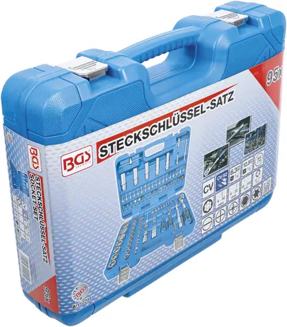 Profesionální gola sada BGS technic se dvěmi ráčnami a 95 díly s profilem Super Lock. Sada nástrčných a zástrčných hlavic a bitů - T-profil s vrtáním i bez, inbus, plochý bit, PH a PZ. Celá sada v chrom vanadiu a matném chromu je uložena v odolném plastovém kufru.