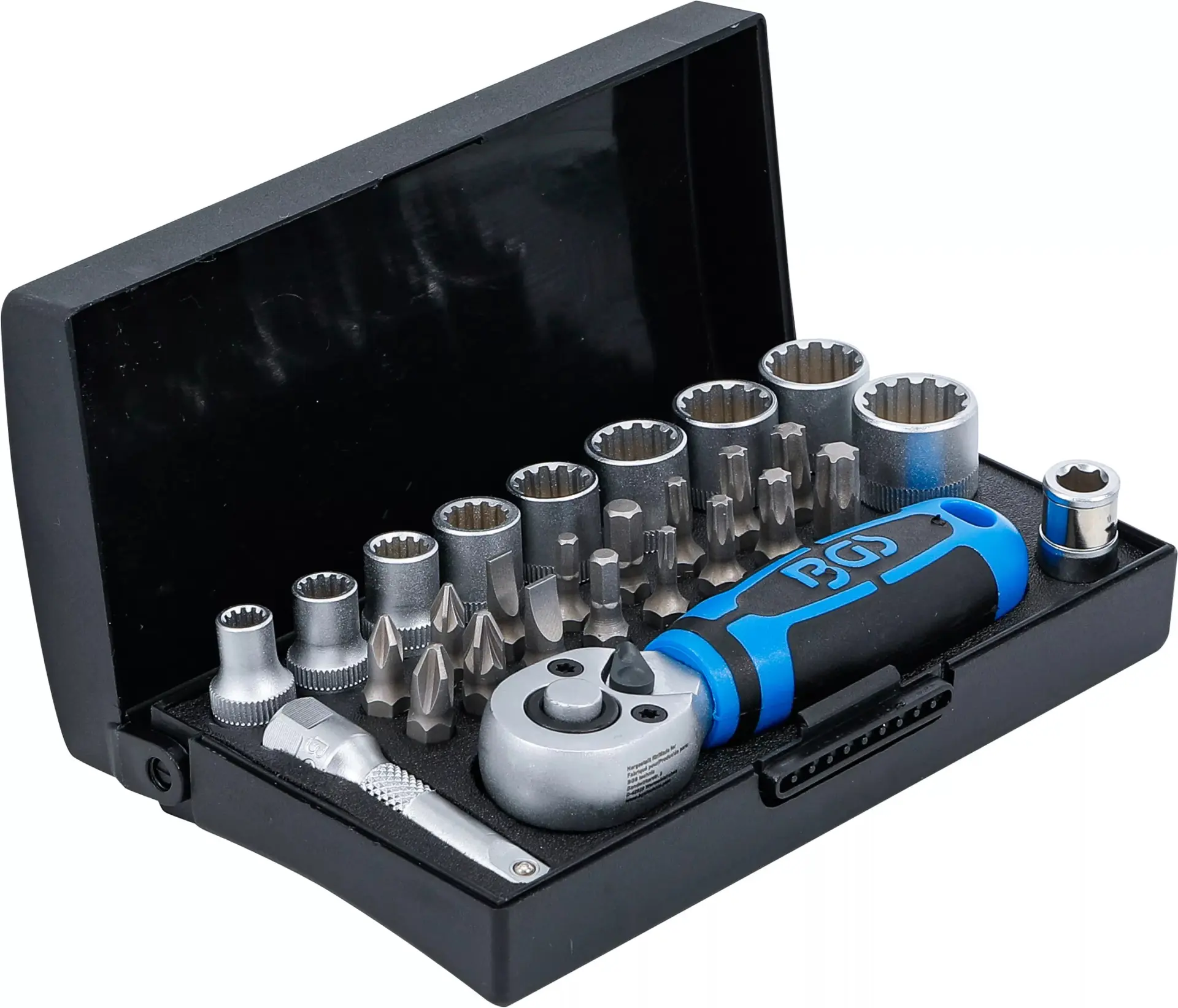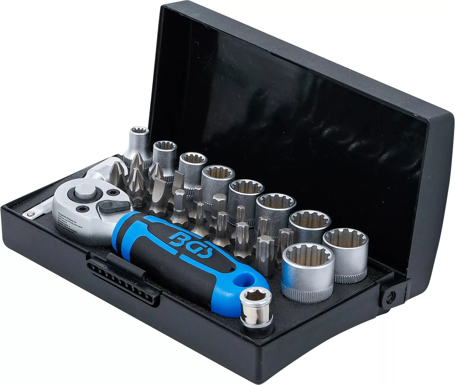 Gola sada 28 dílů s ráčnou 1/4" od německého výrobce BGS technic. Sada nástrčných hlavic, T-profil, plochý bit, PZ a PH. Celá sada v kombinaci chromvanadia a matného chromu.