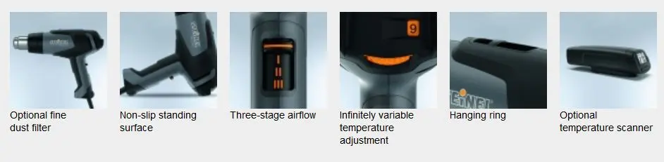 Horkovzdušná pistole Steinel na profesionální úrovni s výkonem 2200 W je výkonným a všestranným pomocníkem pro mnohé práce v dílně i na stavbě. Přístroj váží pouhých 840 g (bez napájecího kabelu) - umožňuje proto dlouhou a neúnavnou práci.