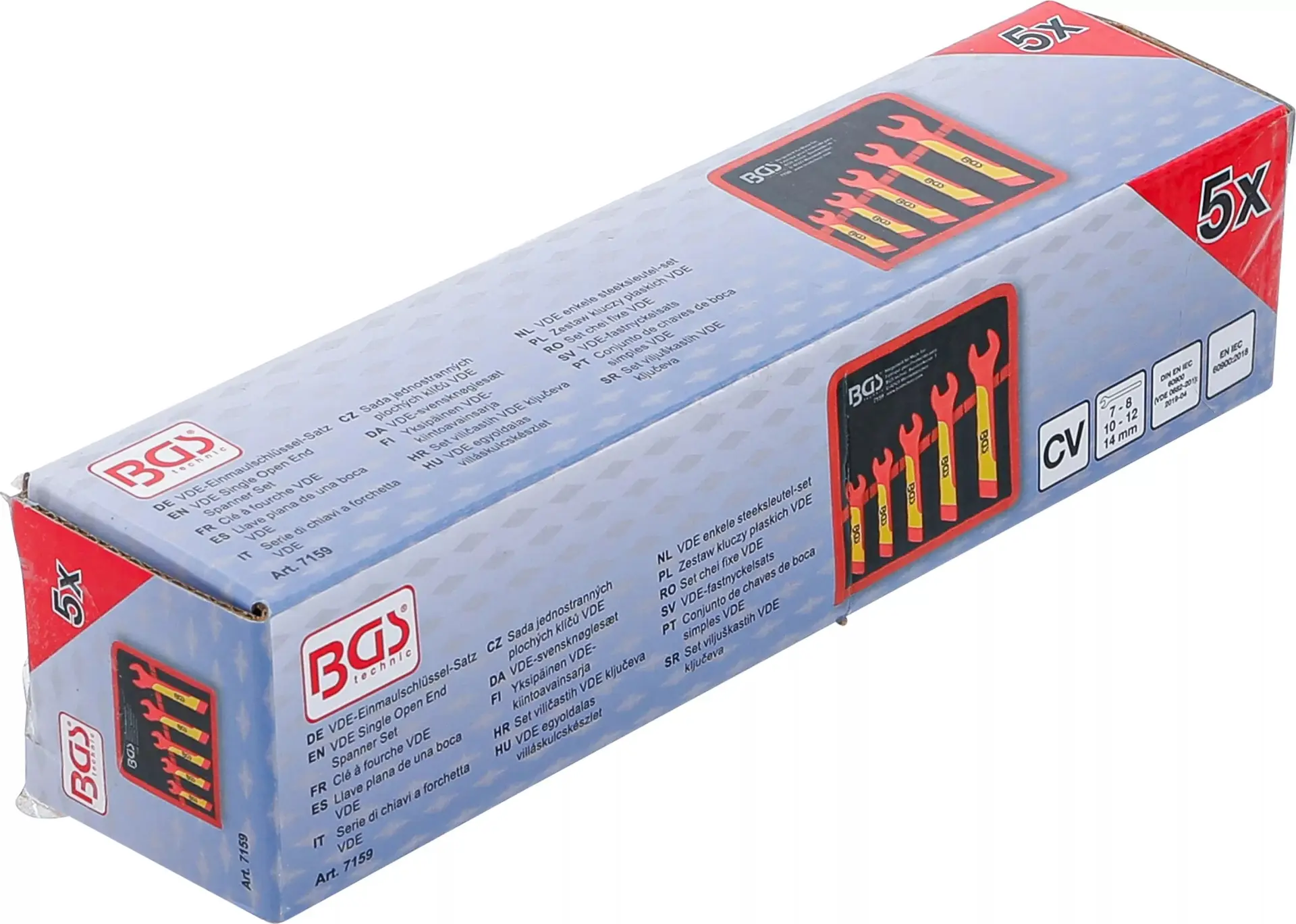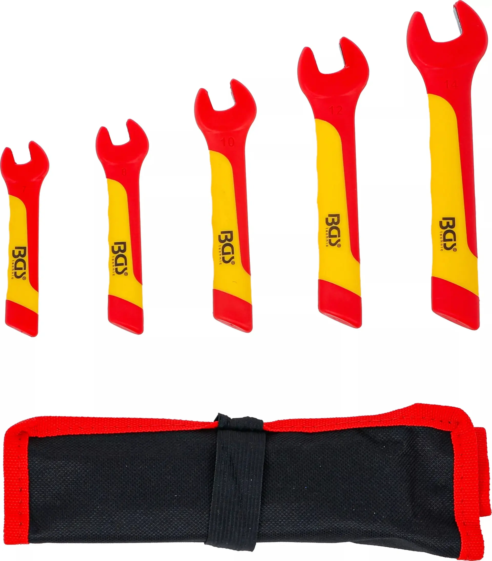 Sada pěti jednostranných plochých klíčů VDE 7–14 mm je určena pro práci pod napětím do 1000 V, splňuje normu EN 60900. Ergonomické rukojeti zajišťují pevný úchop při montážích v elektrotechnice.