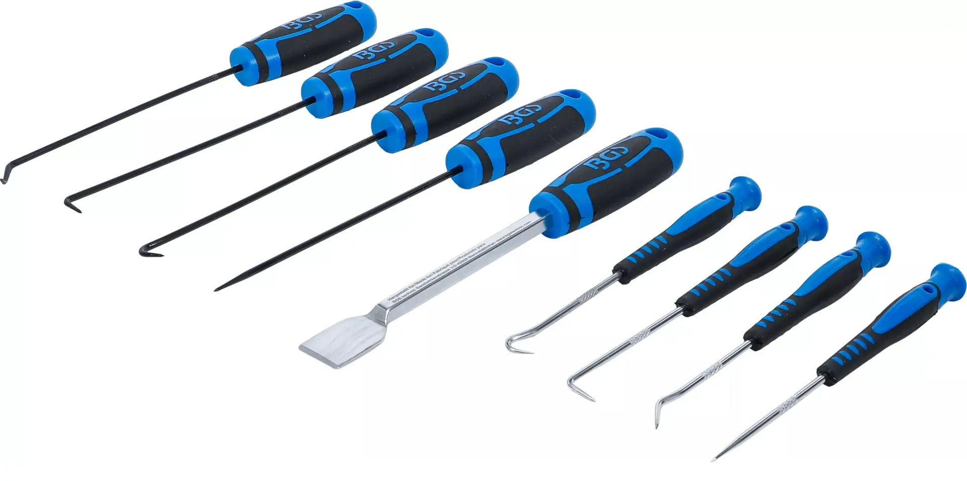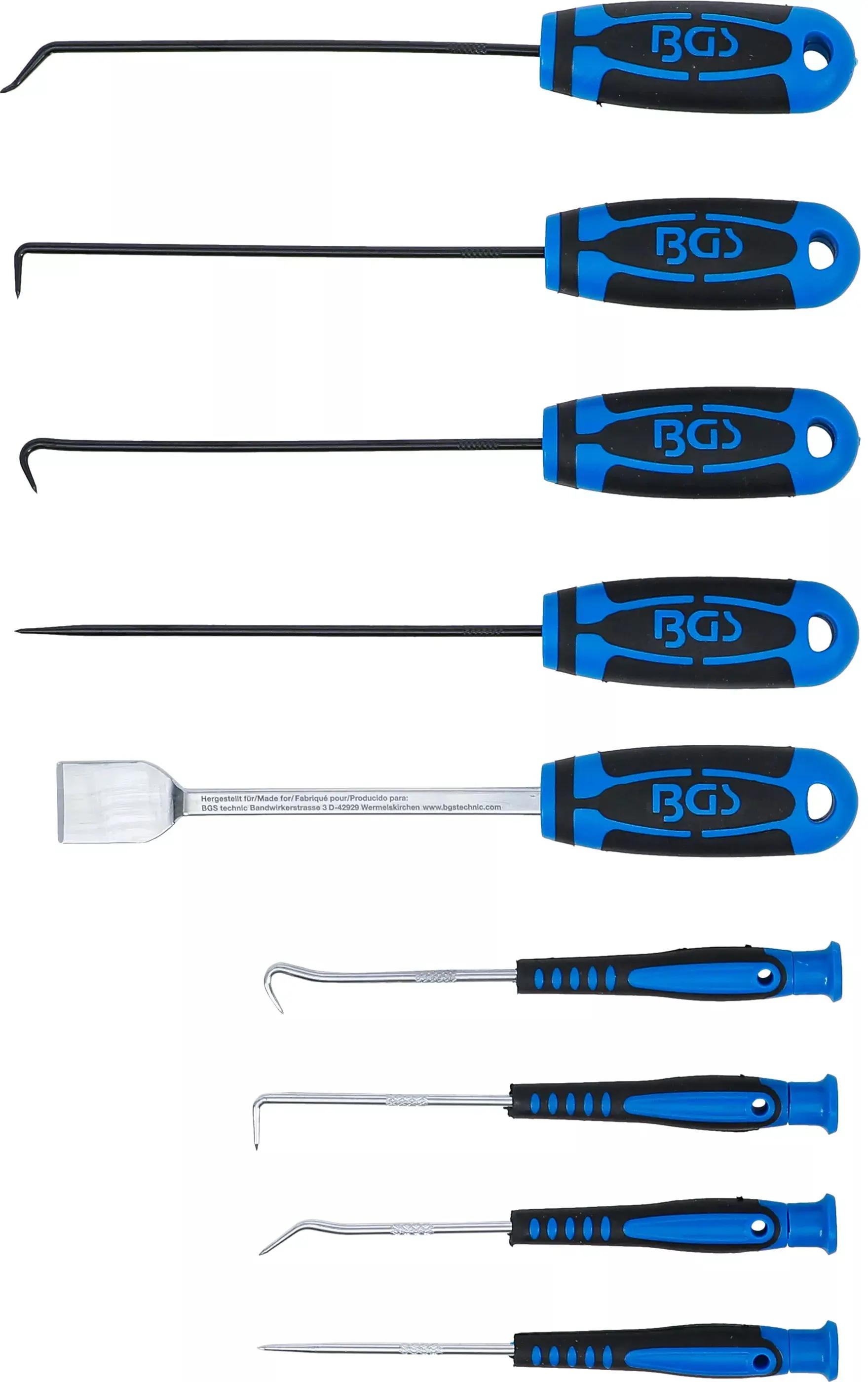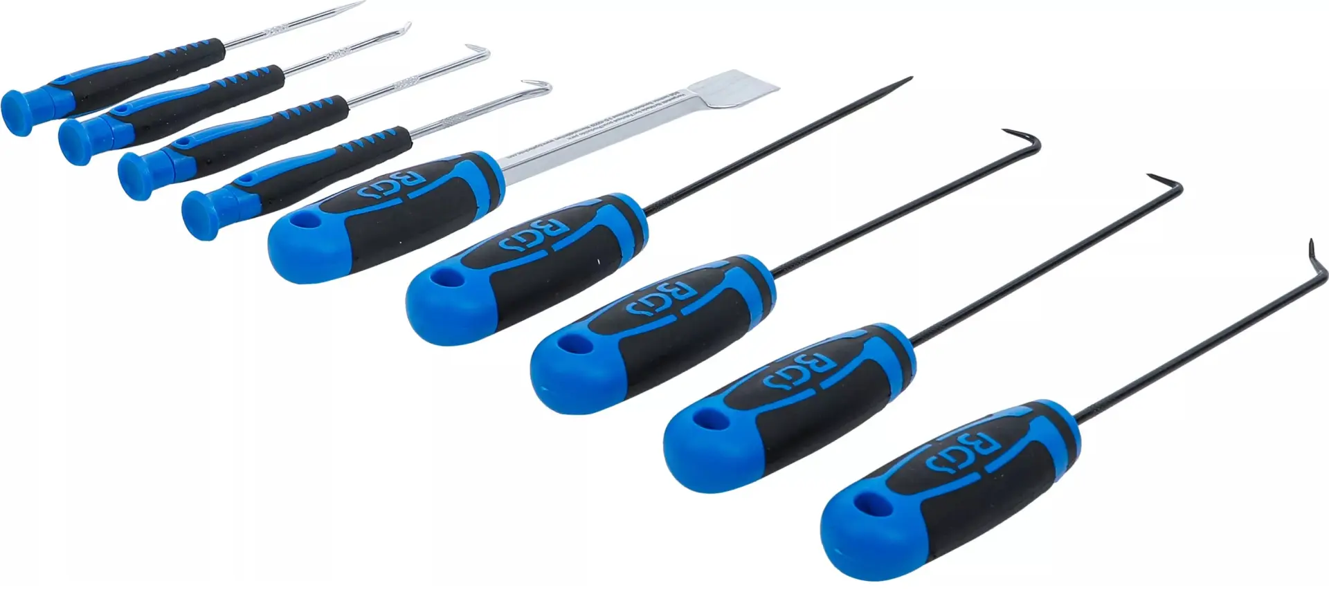 Sada jehel a háků BGS108487 obsahuje 9 různých nástrojů pro práci s těsněním, pružinami nebo O-kroužky, vhodná pro dílnu i domácí použití. Ergonomické rukojeti usnadňují manipulaci a zvyšují přesnost při práci.