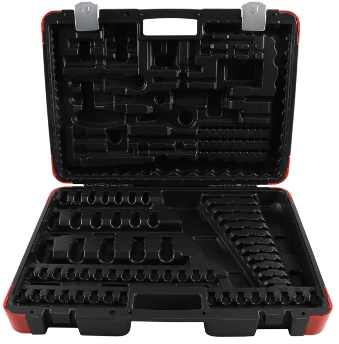 Vnitřní uspořádání pouzdra je přizpůsobeno jednotlivým komponentům sady BGS 15216. Každý nástroj má své vlastní místo, což minimalizuje riziko ztráty nebo poškození během přepravy.
