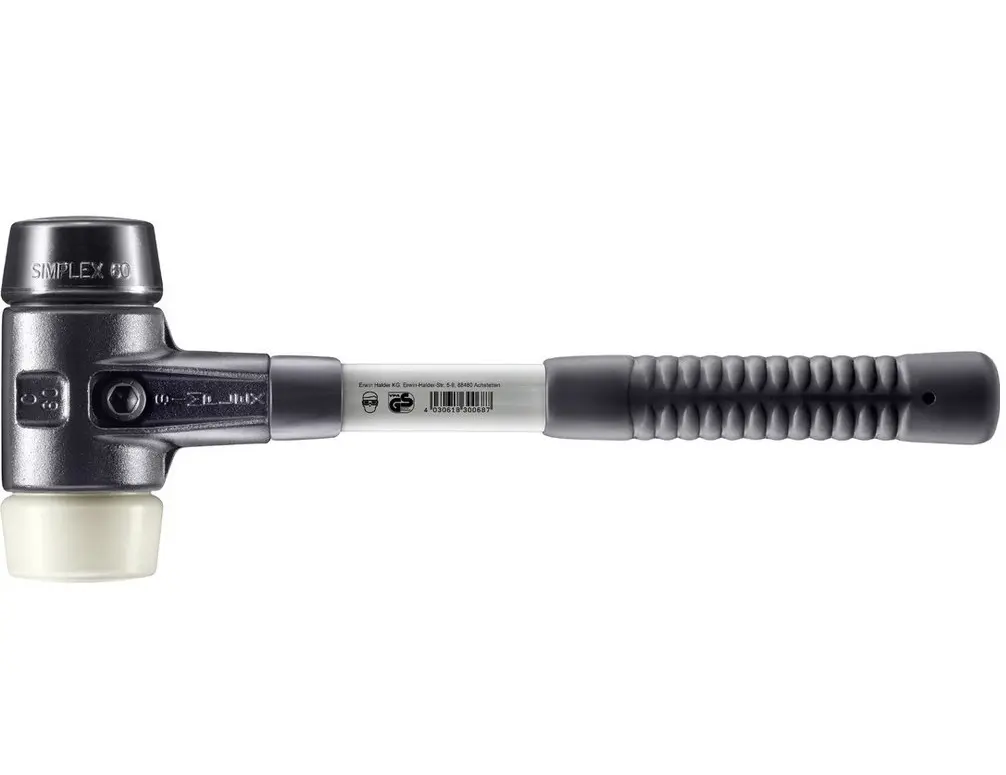 SIMPLEX-kladivo s kombinací vložek z gumového kompozitu (černá, středně tvrdá, tlumící, pachově neutrální, odolná proti opotřebení) / nylonu (bílá, tvrdá, velmi odolná proti opotřebení, žádné vyštípnutí i při teplotách pod bodem mrazu, odolná proti olejům a tukům)