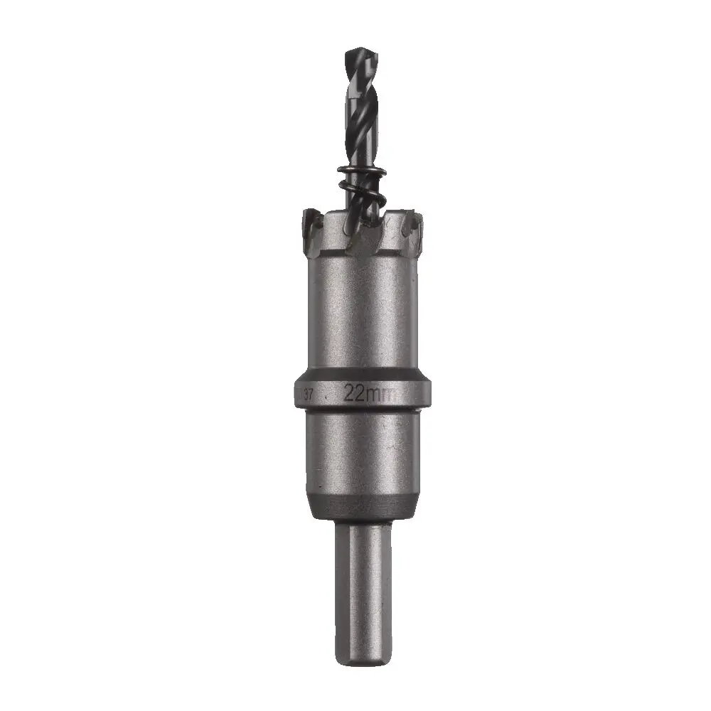 Průměr 22 mm. Jednolitá děrovka s tvrdokovovými zuby TCT, extra hluboká hloubka řezu 25 mm, dorazový límec, vyměnitelný středící vrták a pružina, vhodné pro vrtání ocely, hliníku, zinku, litiny, mědi, skleněných vláken a PVC.
