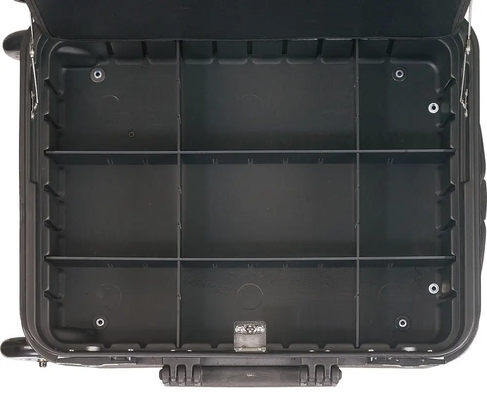 Robustní materiál zajišťuje ochranu uloženého vybavení před mechanickým poškozením i prachem. Kufr je vybaven pevnými uzávěry, které zabraňují nechtěnému otevření během transportu. Díky ergonomickému madlu je manipulace s kufrem pohodlná i při plném zatížení.