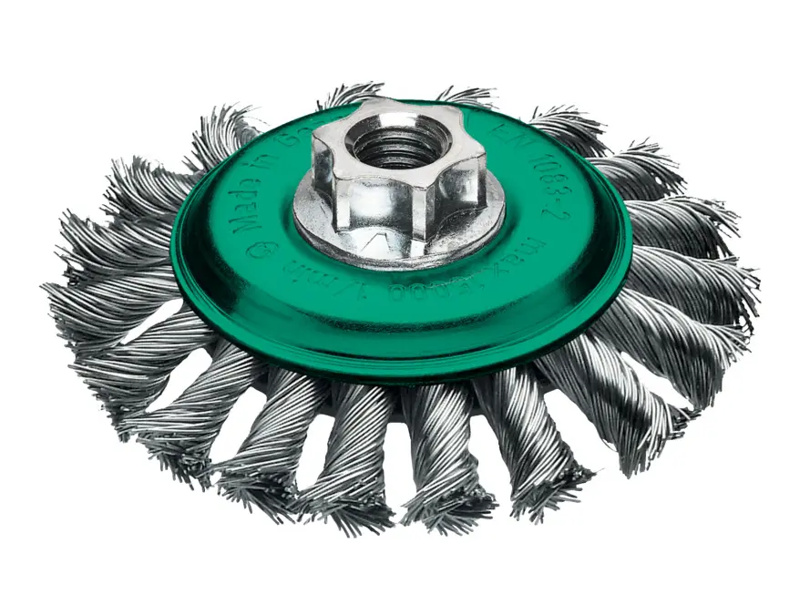 Vhodné pro úhlové brusky 115 mm a 125 mm. Kuželové kartáče se splétaným drátem se používají k opracování těžko dostupných míst, ke zpracování svárů a k odstraňování okují, rzi, nátěrů a strusky.