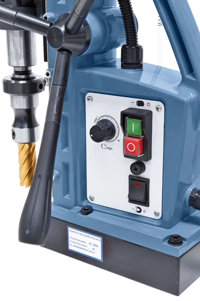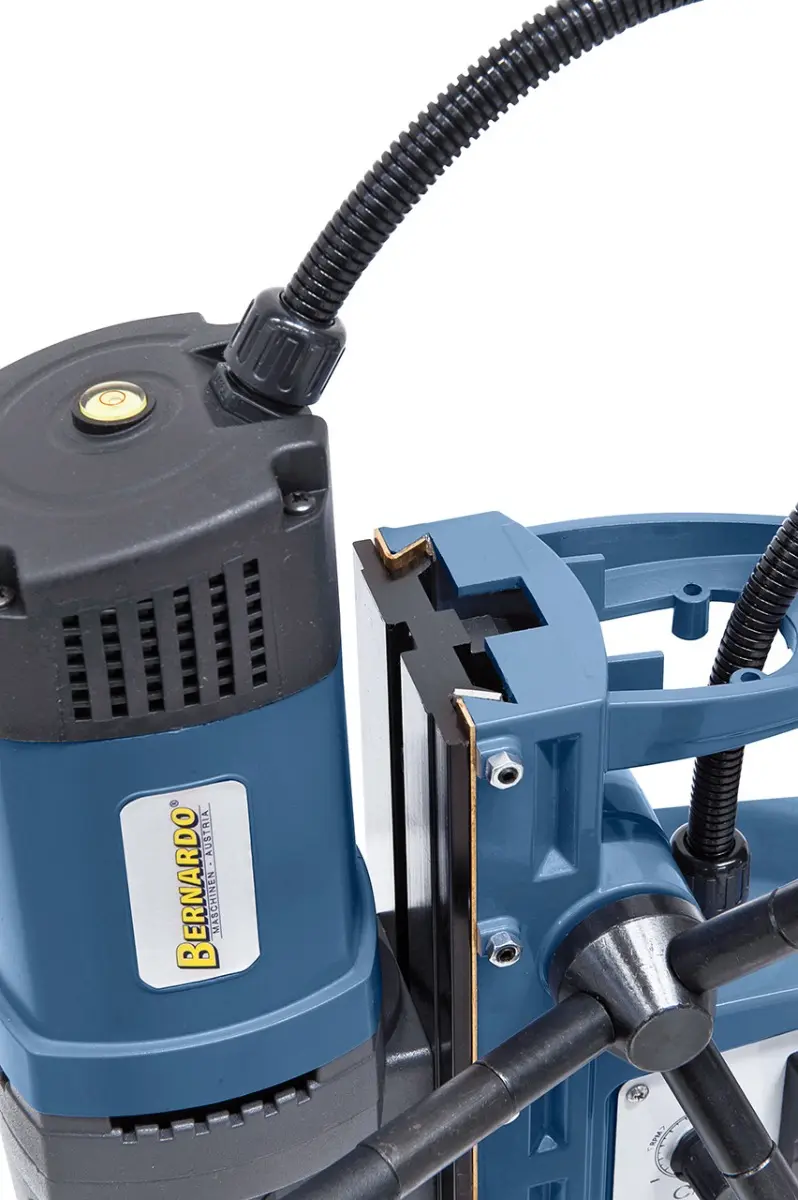 Magnetická vrtačka Bernardo s regulací otáček určená pro jádrové vrtání průměrů 12 ÷ 98 mm. Výkonný hnací motor, kužel vřetena MK 3/upínač Weldon 19 mm, hloubka vrtání s jádrovými vrtáky 75 mm.