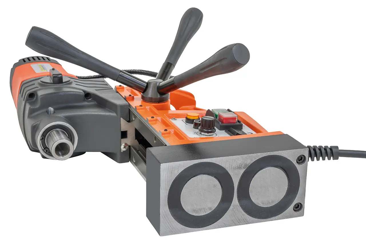 napájecí napětí 230 V, příkon 1,7 kW, otáčky (2 st. - plynule) 100 ÷ 560 U.min-1, vrták/korunka pr. 22/50 mm, hl. vrtání 35 mm, vysunutí pinoly 160 mm, upínání Weldon 19/MK 2, přídržná síla 14500 N, rozměry 330 x 220 x 570 mm
