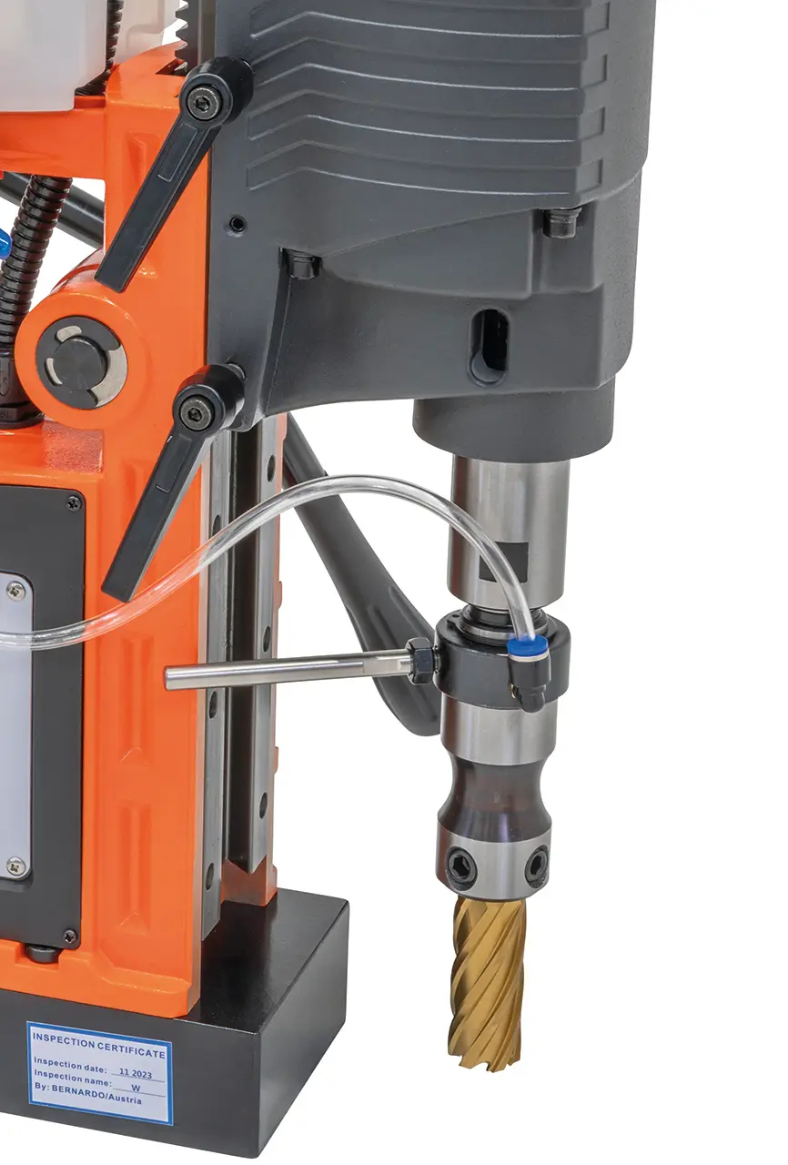 napájecí napětí 230 V, příkon 1,89 kW, otáčky (2 st. - plynule) 100 ÷ 520 U.min-1, vrták/korunka pr. 25/65 mm, hl. vrtání 50 mm, vysunutí pinoly 200 mm, upínání Weldon 19/MK 3, přídržná síla 15800 N, rozměry 360 x 290 x 640 mm