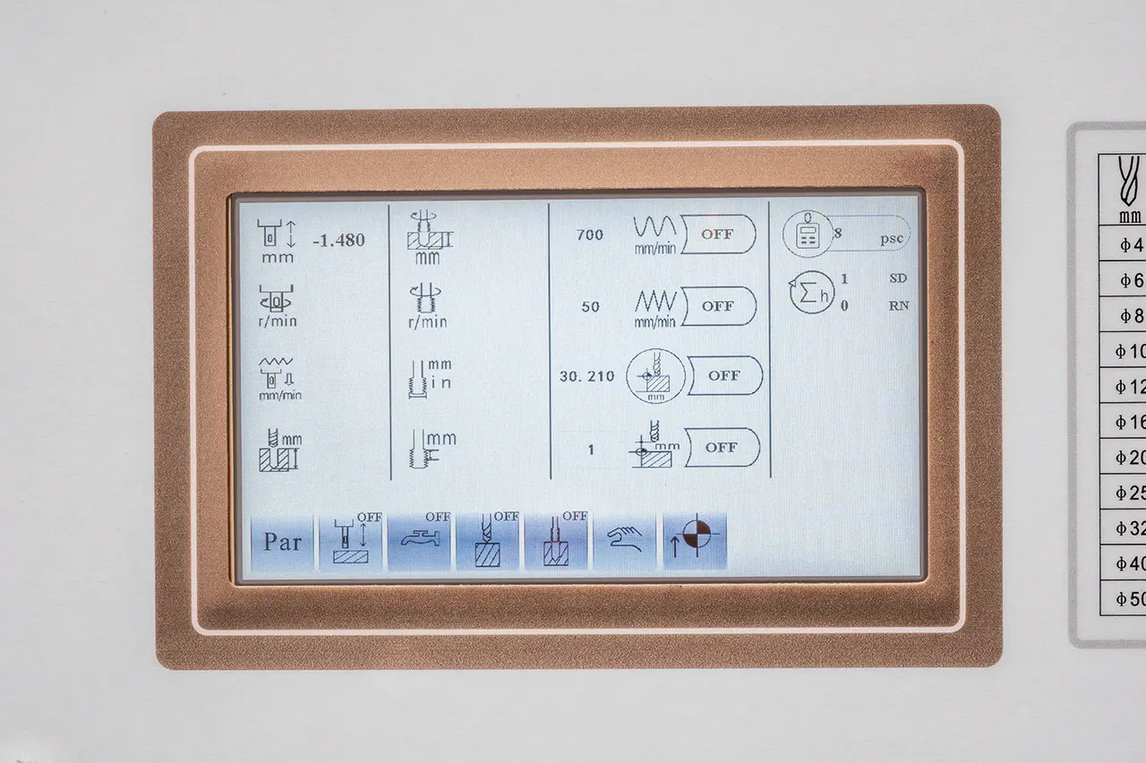 Standardně dodávaný systém řízení vypočítá ideální otáčky nebo posuv pro vrtání a řezání závitů po zadání průměru nástroje a materiálu (litina/ocel)