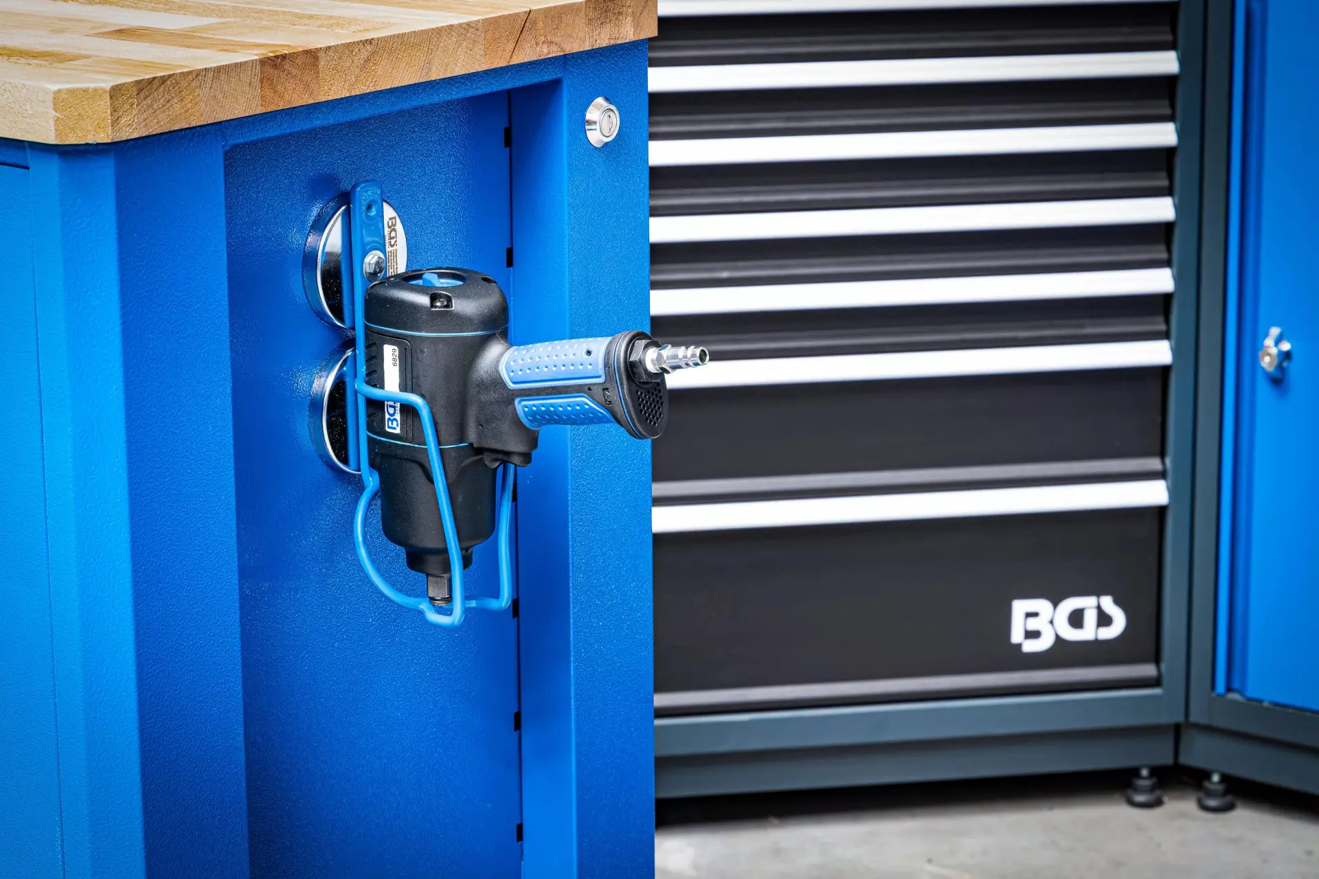 Držák který umožňuje rychlé uchycení, zavěšení nářadí na kovové povrchy a zvyšuje pořádek i dostupnost v dílně. Kompatibilní s většinou běžných vzduchových utahováků, vrtaček.
