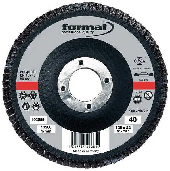 Provedení: Zirkonkorundové lamely (ZA). Agresivní provedení, vysoce pevné usazení pojivem z umělé pryskyřice do talíře ze sklotextilu, vypouklého o 6°. Vyrobeno bez obsahu železa, síry a chlóru v pojivu. Normovaný otvor 22,23 mm.