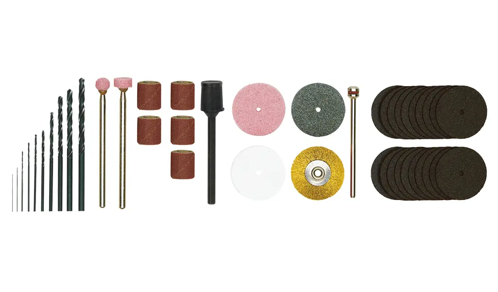 Součástí balení je sada 34 nástrojů, které pokrývají široké spektrum činností – od broušení, leštění, vrtání až po řezání. Nástroje jsou uloženy v praktickém plastovém kufříku, což usnadňuje jejich přenášení a organizaci. Výměna nástavců je rychlá díky systému upínání s aretací vřetena.