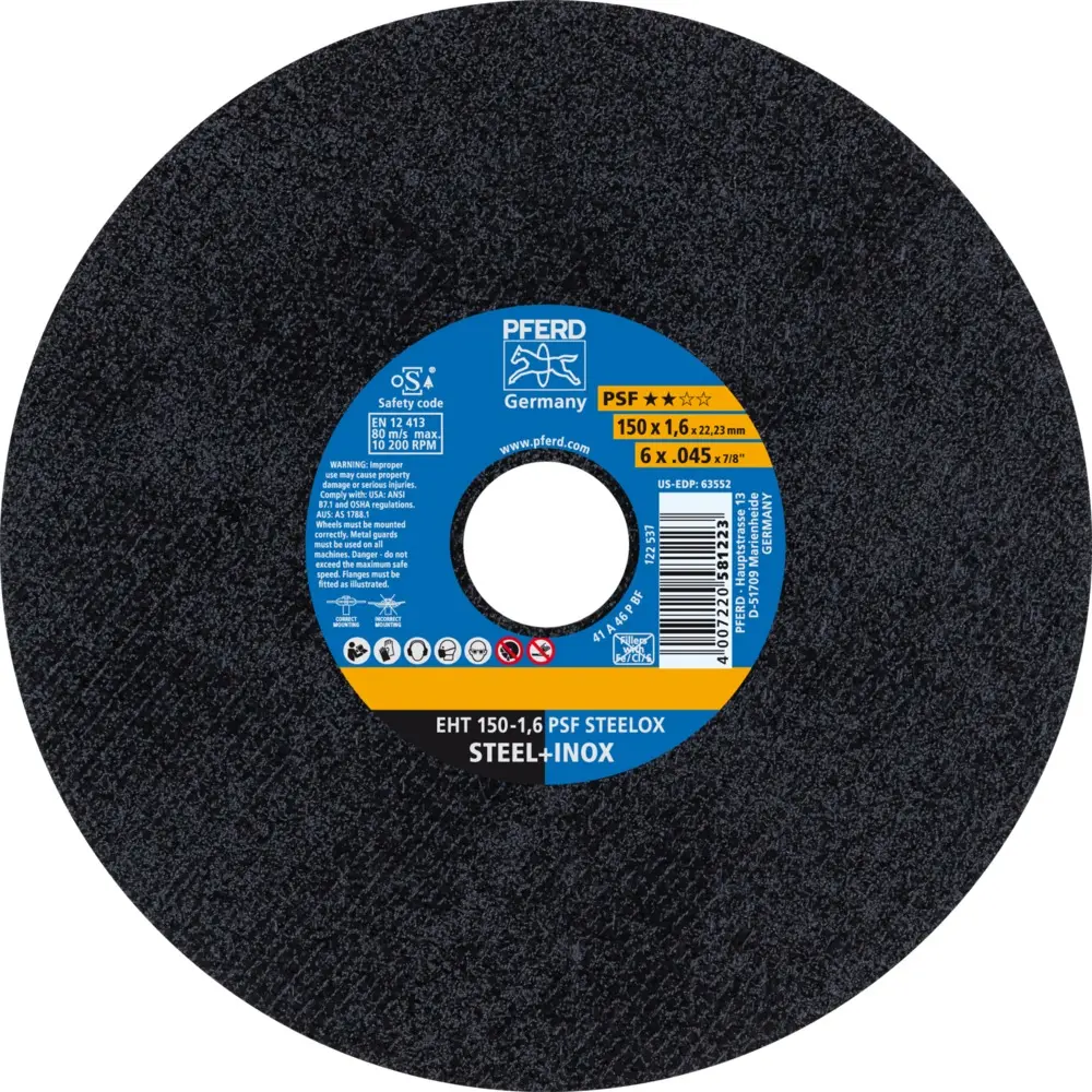 Rozbrušovací kotouč Pferd EHT 150-1,6 PSF STEELOX je určen pro řezání oceli a nerezové oceli, má průměr 150 mm a tloušťku 1,6 mm. Vhodný pro úhlové brusky, zajišťuje přesný a rychlý řez.