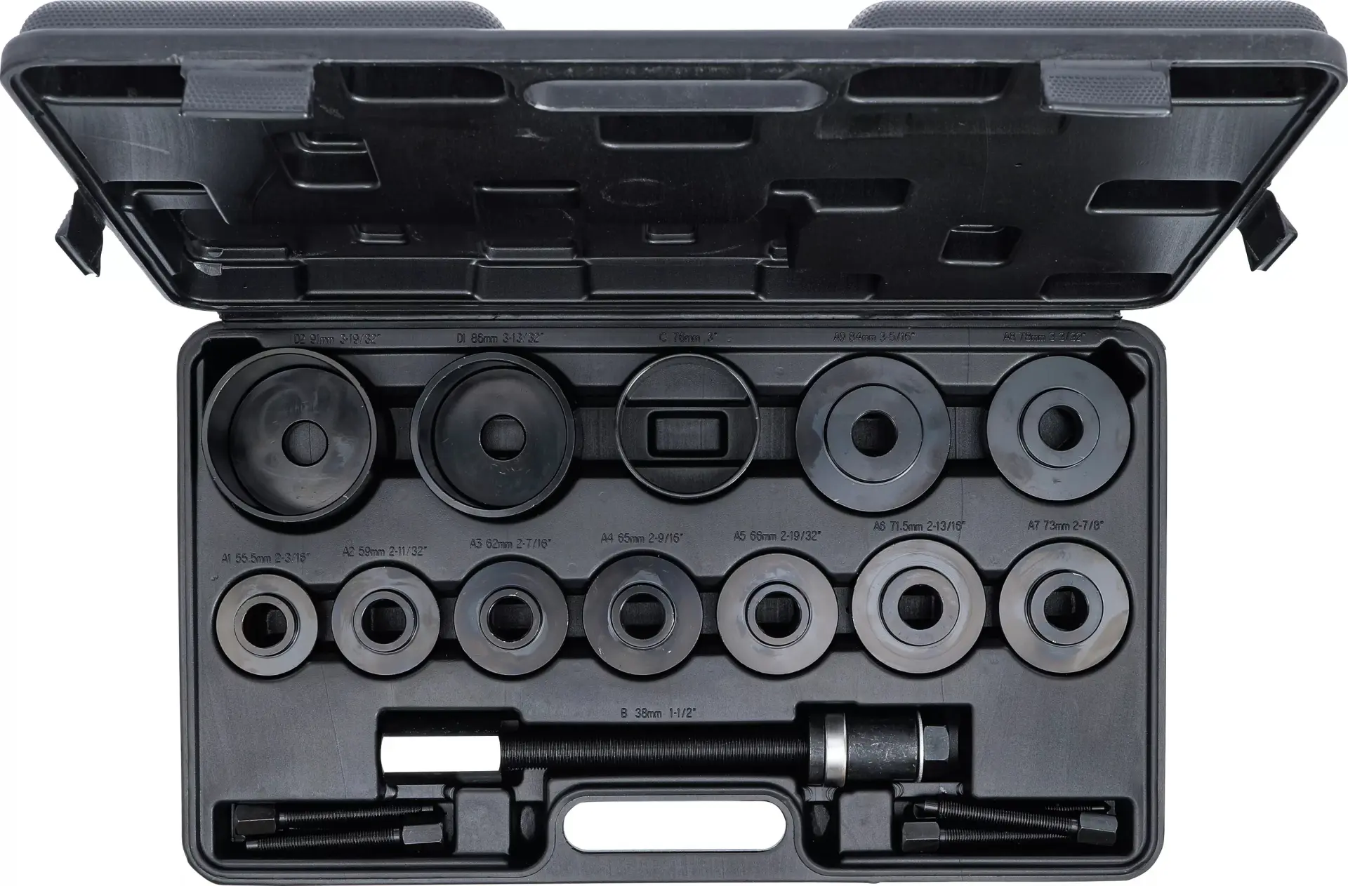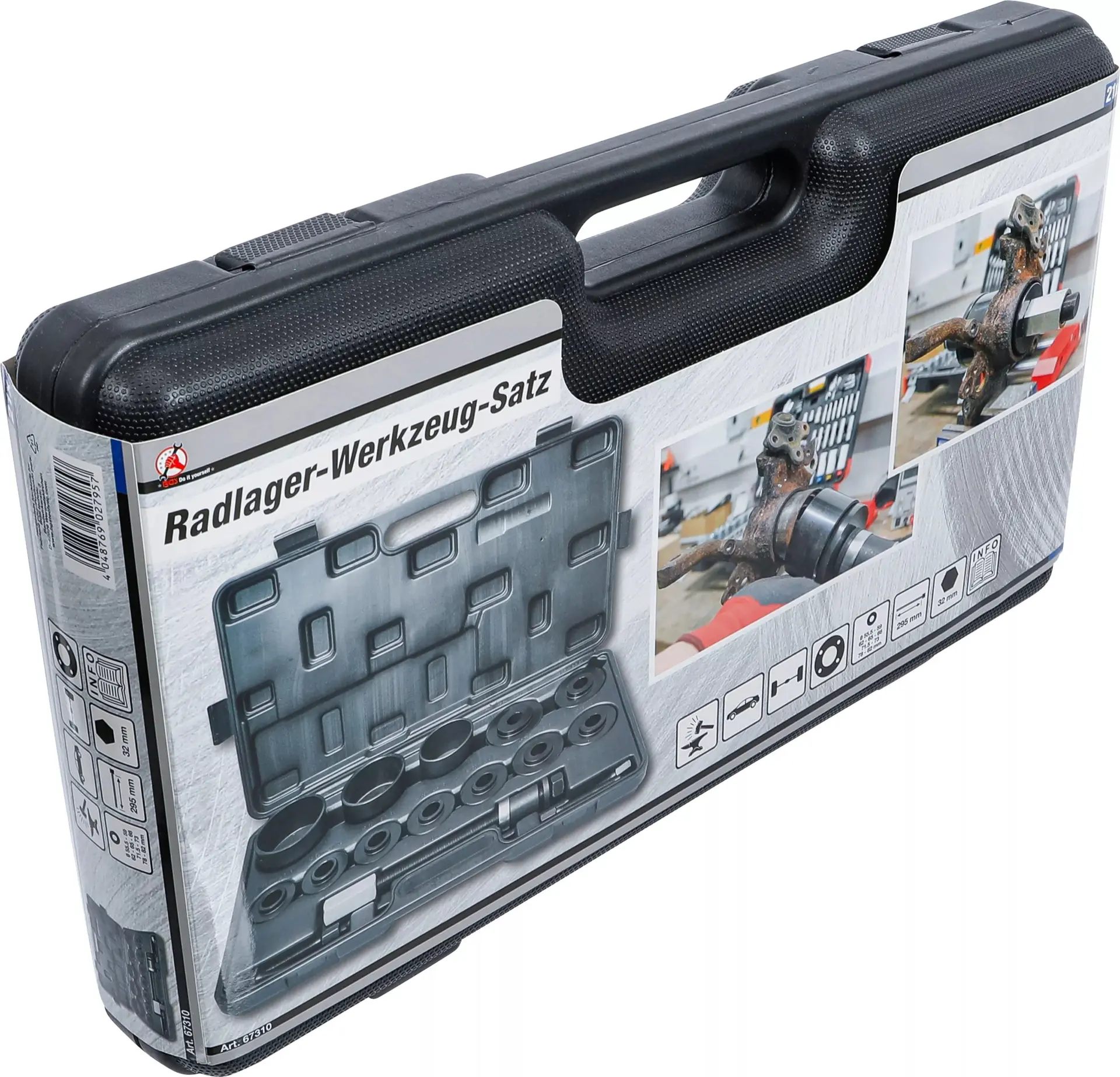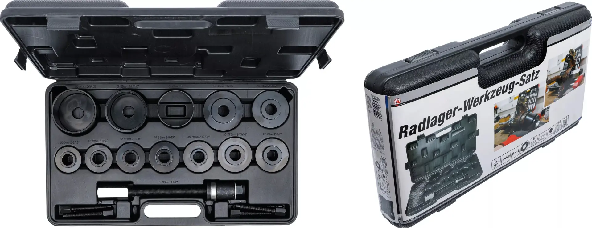 Univerzální 21dílná sada BGS1067310 obsahuje nástroje pro montáž a demontáž ložisek kol, vhodná pro různé typy vozidel a průměry ložisek. Robustní kufřík usnadňuje přenášení i skladování.