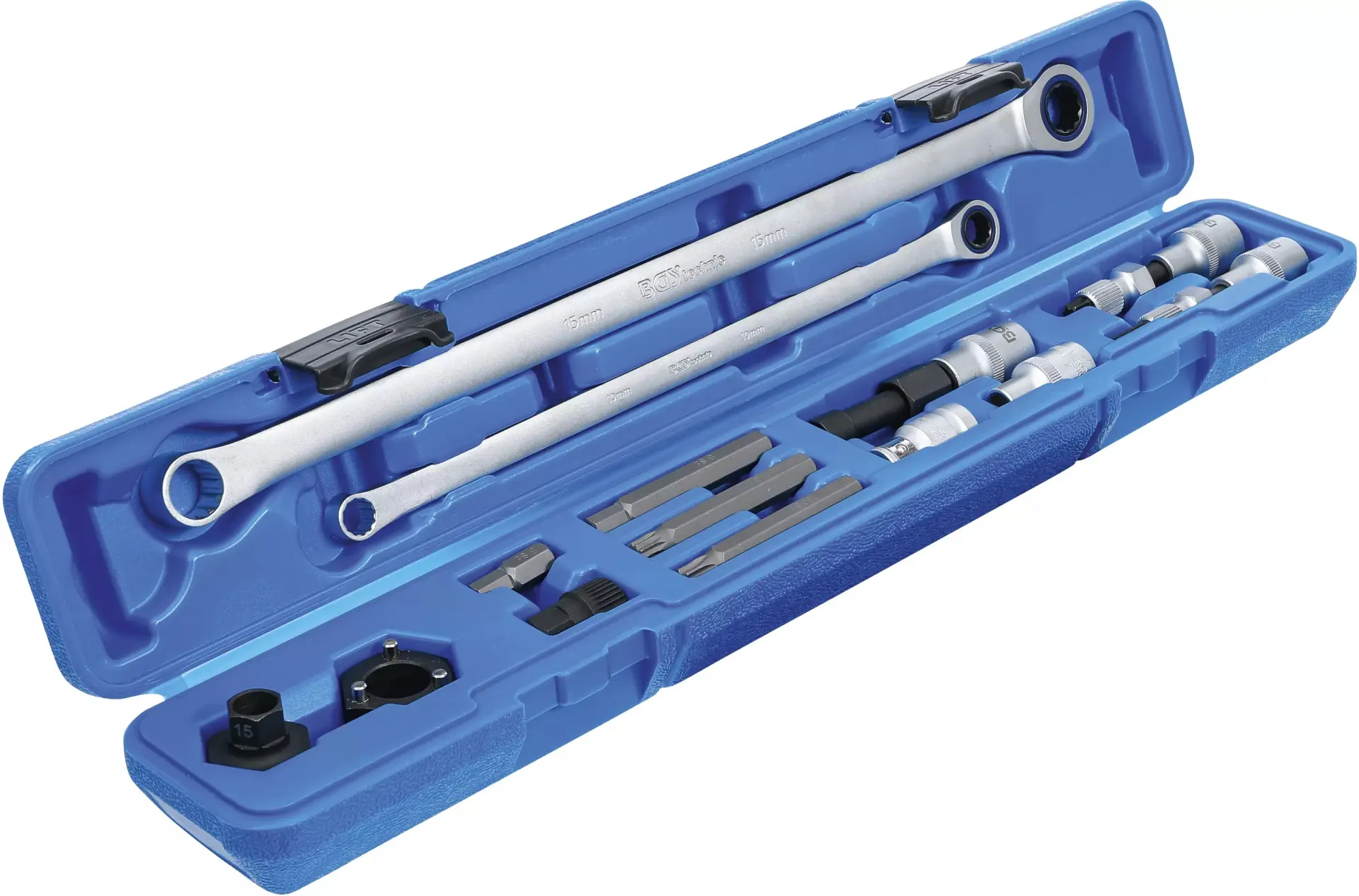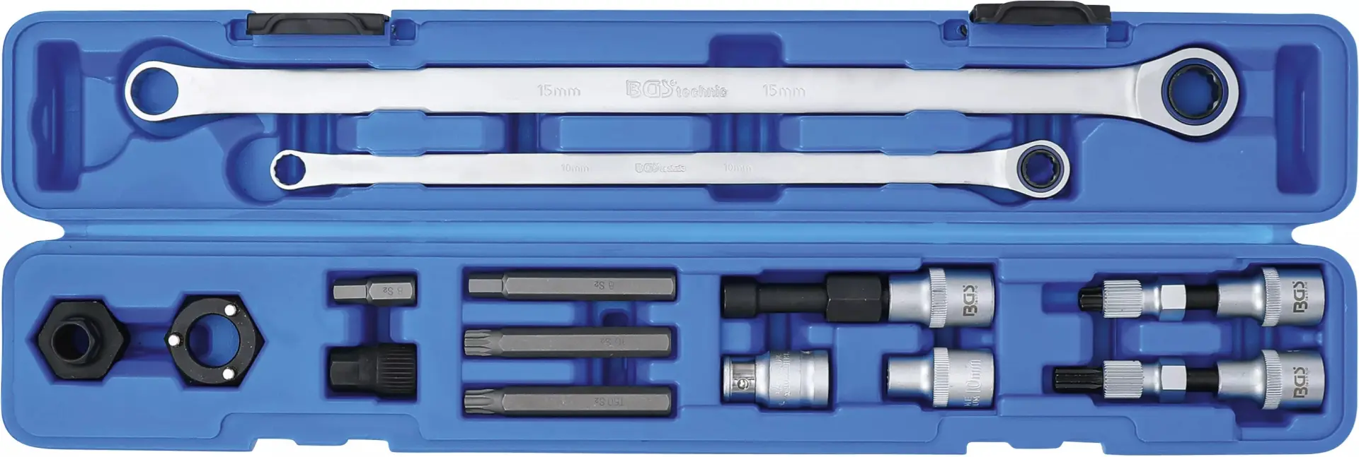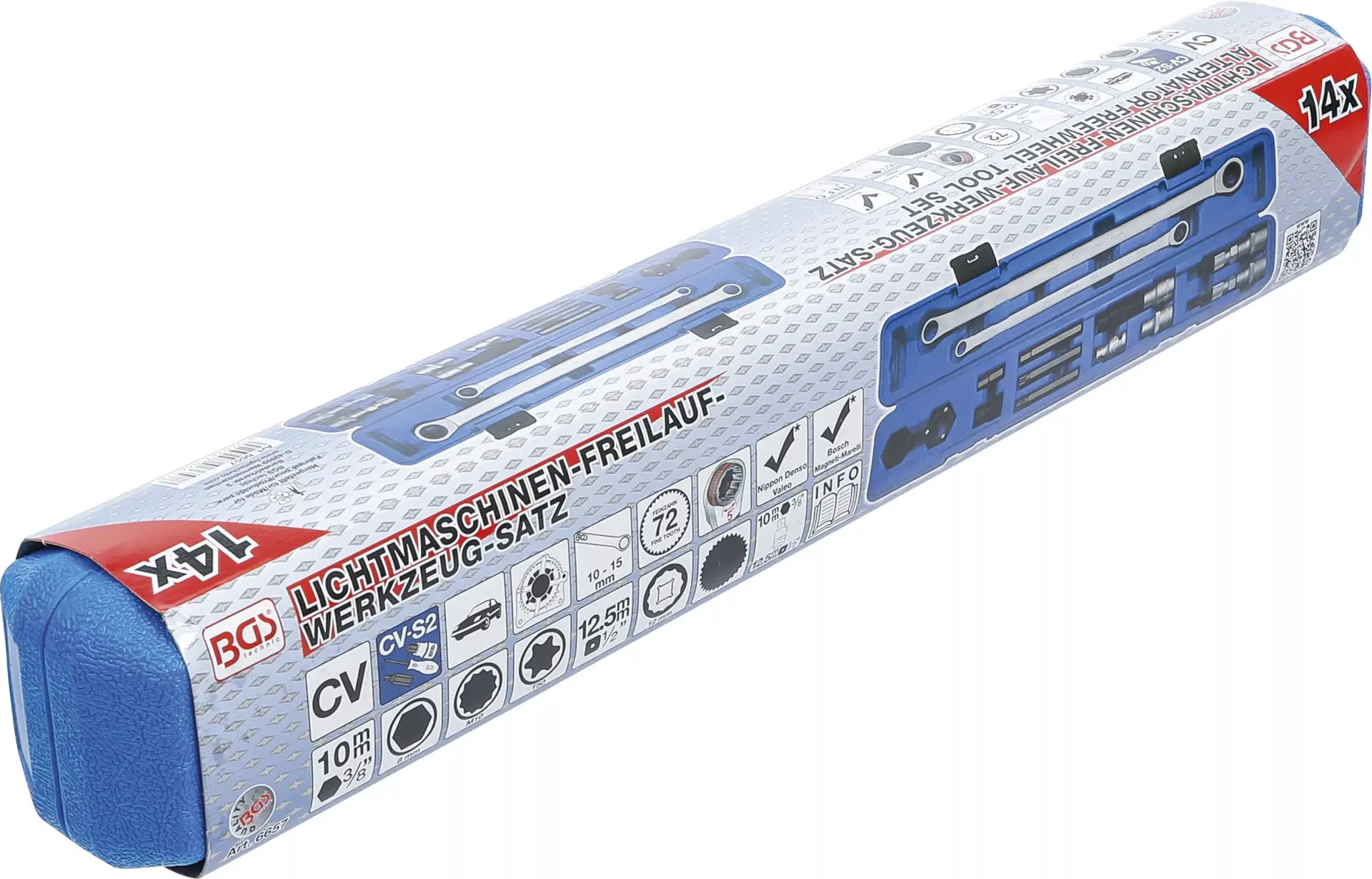 Sada nářadí na volnoběžky alternátorů BGS106657 obsahuje 14 dílů určených pro demontáž a montáž volnoběžných řemenic alternátorů různých značek vozidel. Robustní kufřík usnadňuje přenášení a udržuje všechny komponenty přehledně uspořádané.