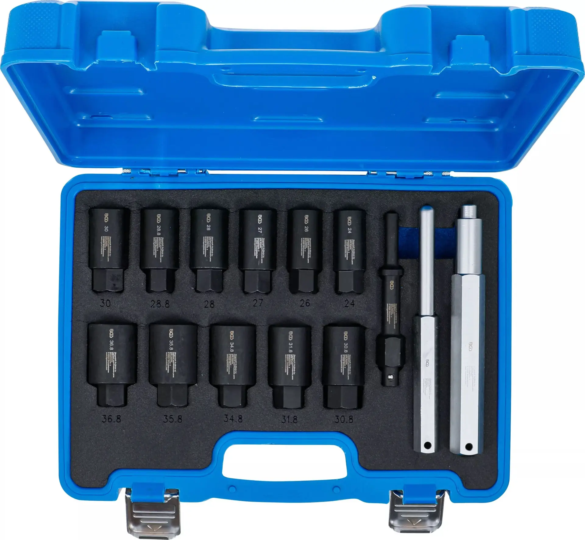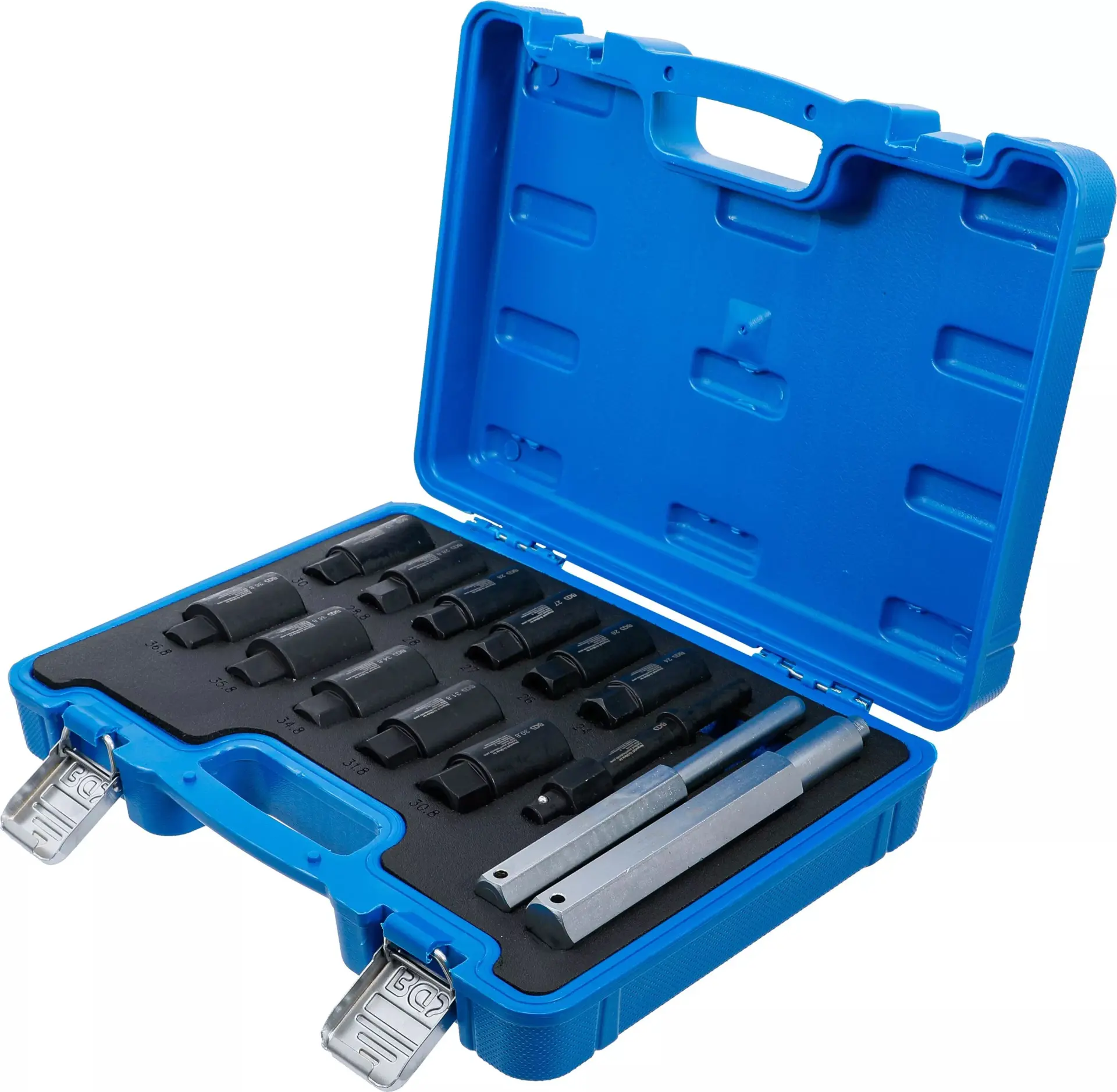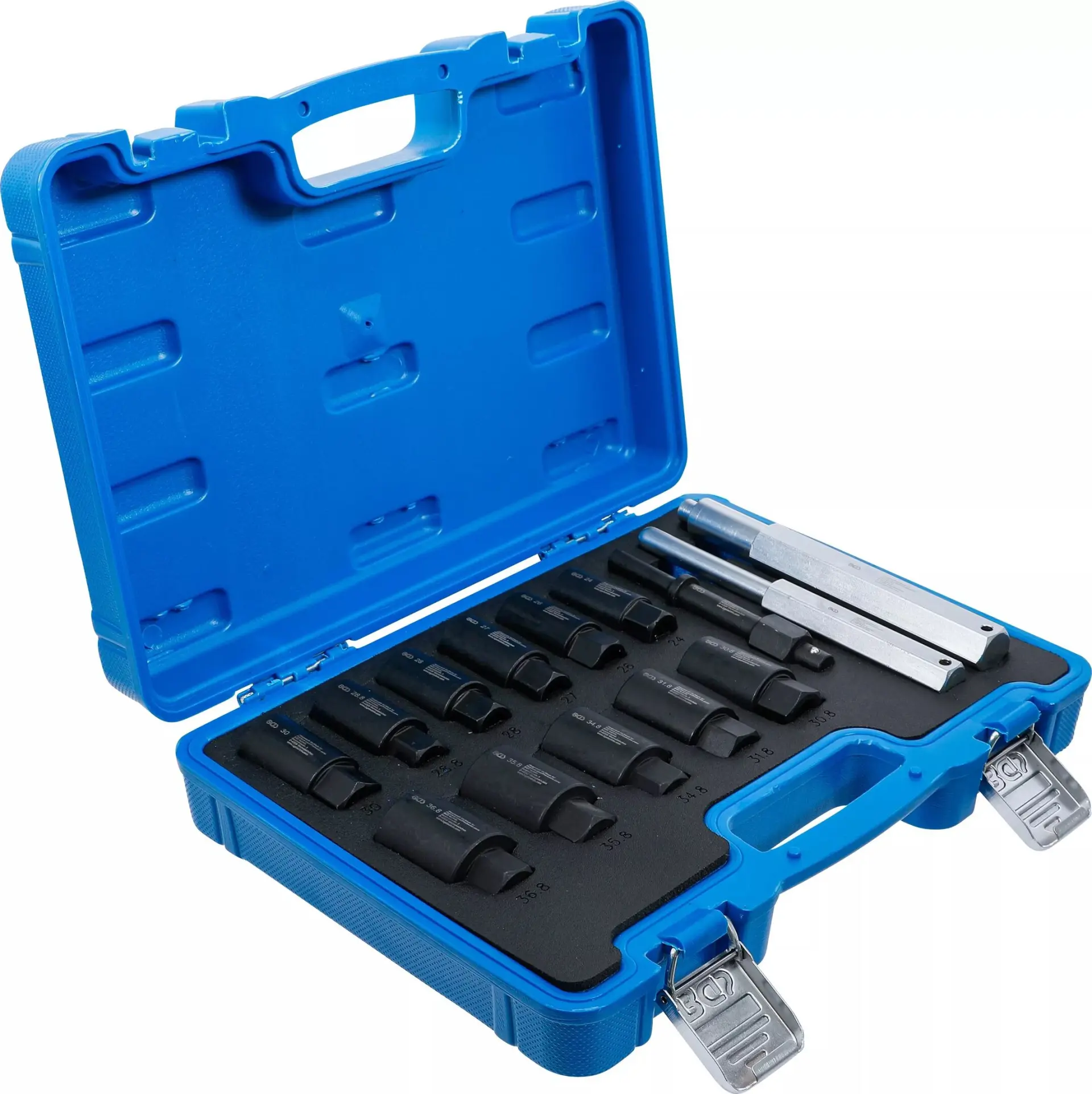 Sada 14 nástrčných hlavic BGS1074448 je určena pro demontáž bezpečnostních šroubů kol, kompatibilní s různými typy automobilů a vyrobena z odolné oceli. Praktické balení usnadňuje přenášení i skladování v dílně nebo autě.