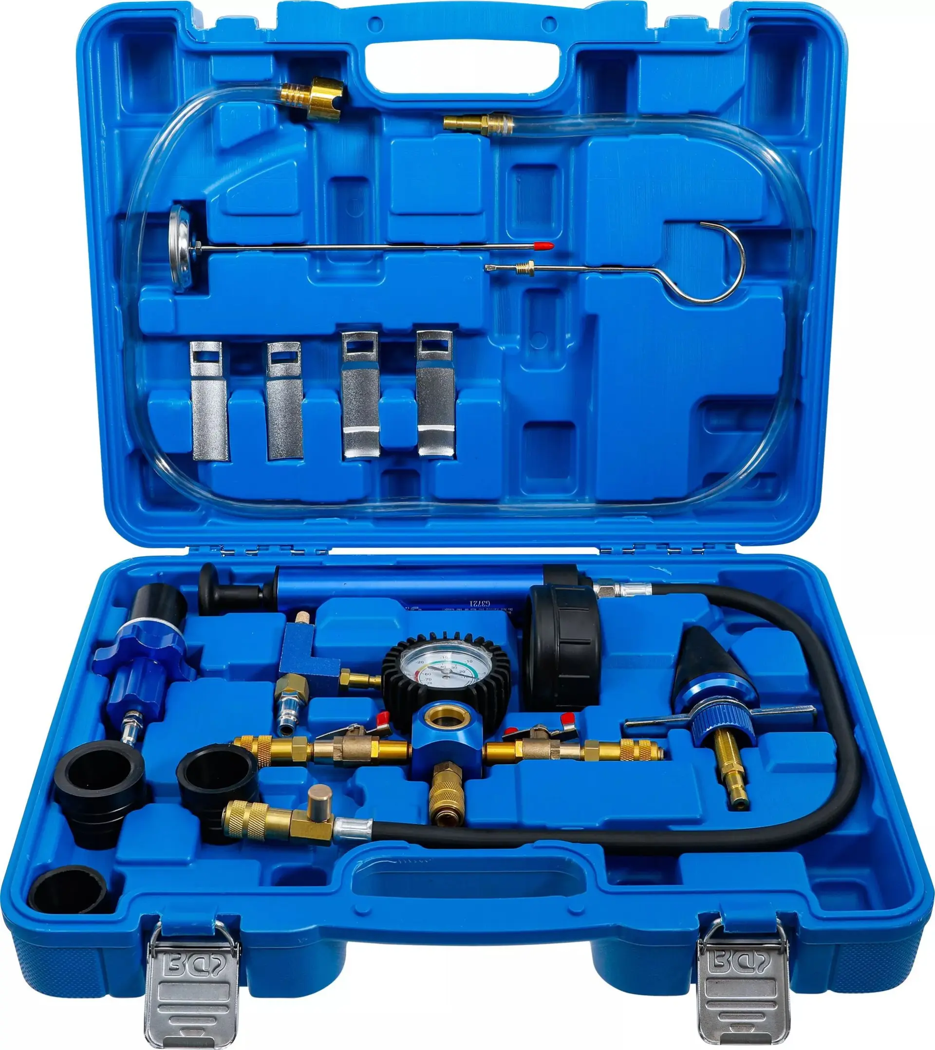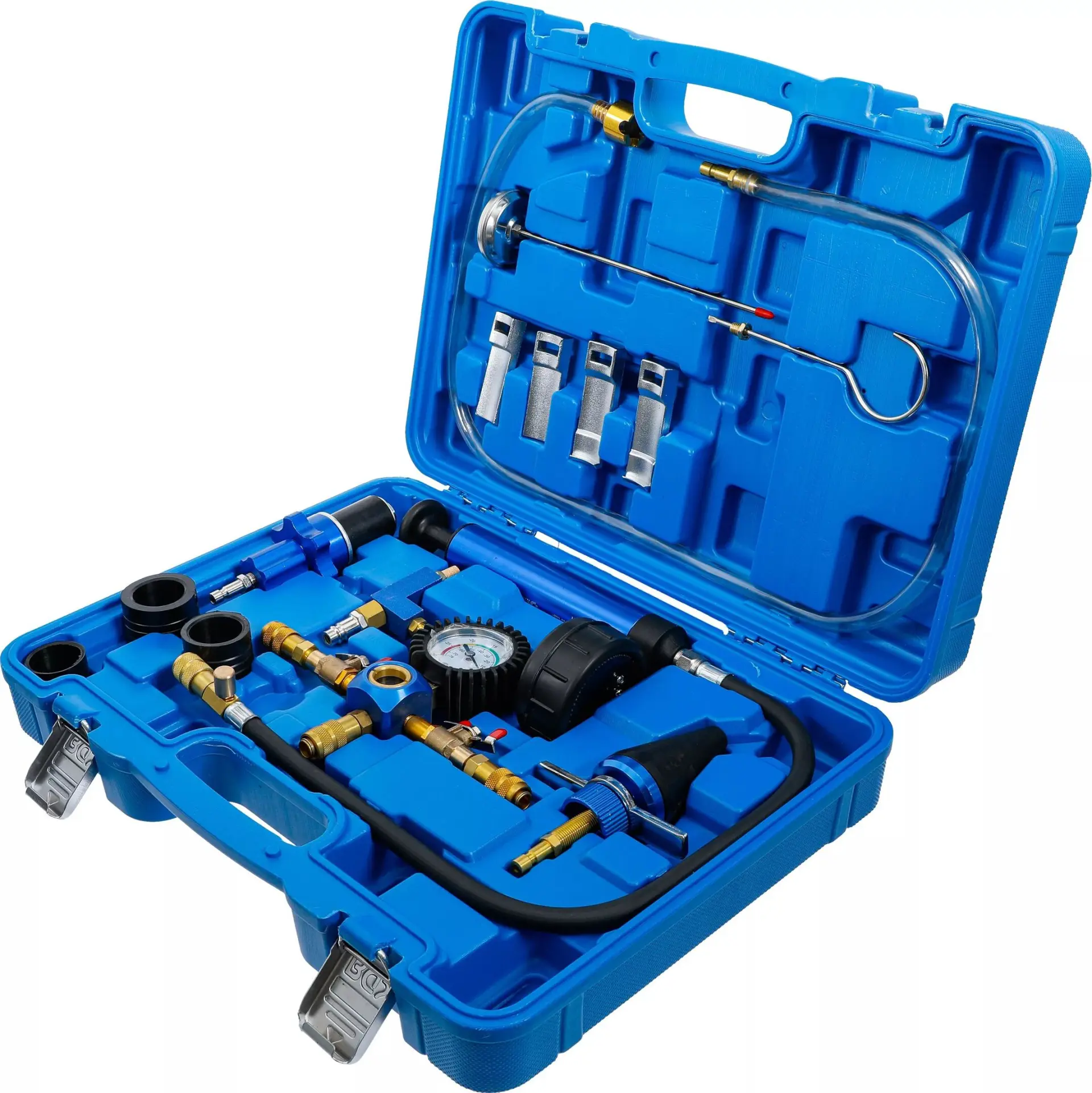 Sada 13 dílných nástrojů BGS1074405 umožňuje rychlé zjištění netěsností a kontrolu tlaku v chladicím systému vozidel různých značek. Ergonomické adaptéry a manometr zajišťují přesné měření a snadnou manipulaci.