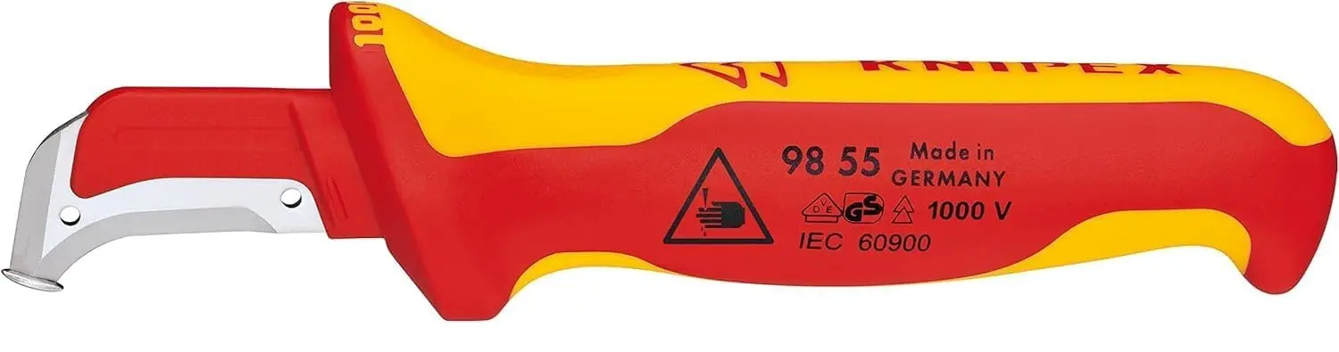Nůž na pláště Knipex 98 55 s izolací do 1000 V podle VDE, délka 155 mm, je určen pro bezpečné odizolování kabelů při elektroinstalacích. Ergonomická rukojeť zajišťuje pevný úchop a přesné vedení řezu.