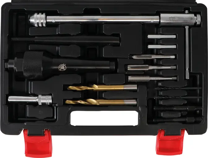 Opravná sada Kraftmann BGS1098297 umožňuje rychlou opravu poškozených závitů žhavicích svíček, obsahuje potřebné nástroje a závitové vložky pro různé velikosti. Vhodná pro použití v dílně i garáži.