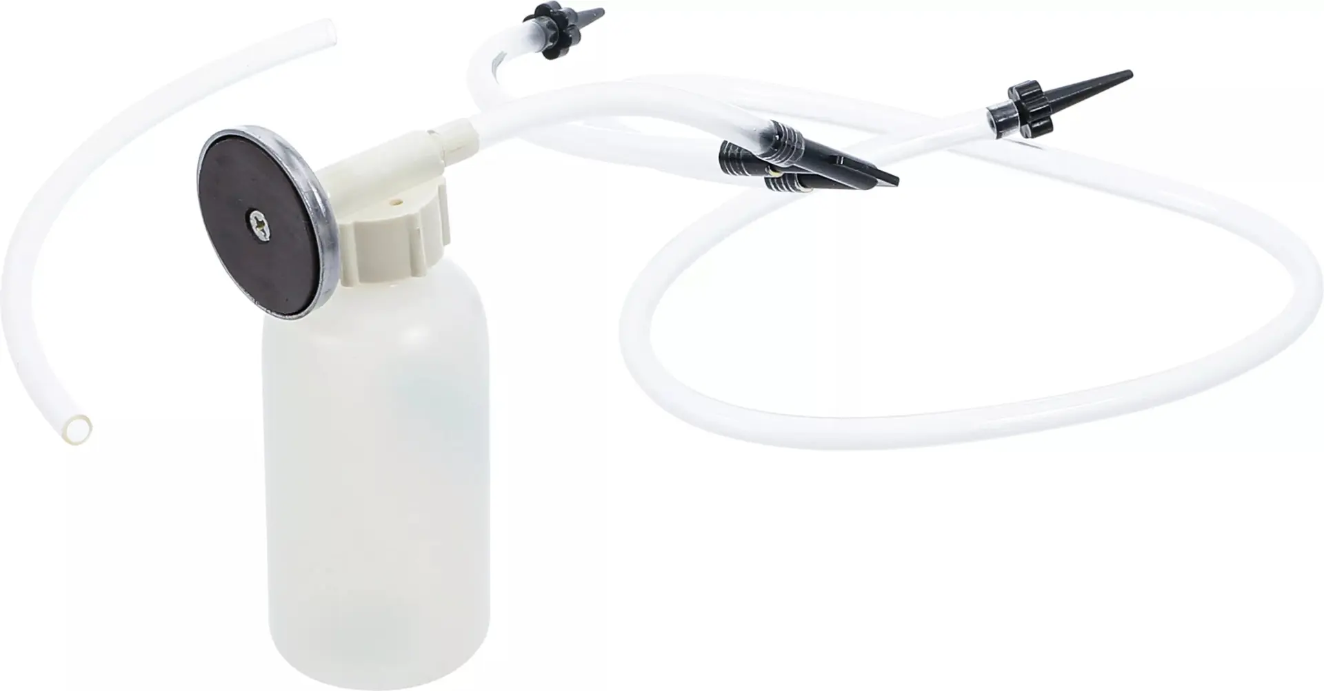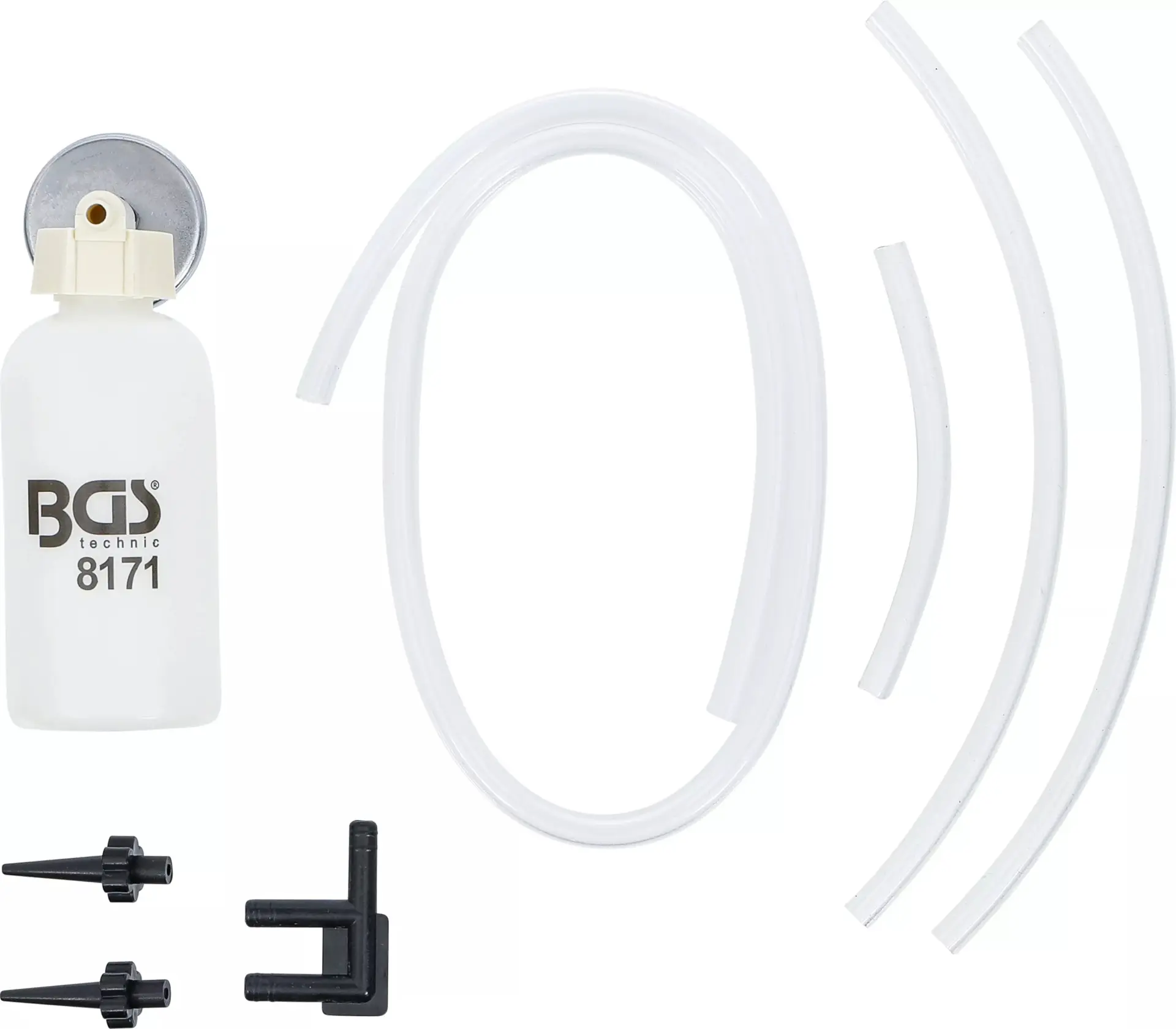 Nádoba BGS108171 je určena pro odvzdušnění brzd a spojky motocyklů, disponuje praktickým háčkem pro zavěšení a objemem 250 ml. Průhledné provedení umožňuje snadnou kontrolu hladiny kapaliny během práce.