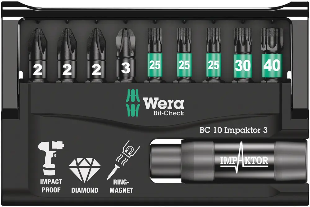 Robustní krabička Bit-Check od firmy Wera. Krabičky Bit-Check umožňují rychlý přehled o dostupném nářadí. Nepotřebné bity se jednoduše vrátí do krabičky, aby se neztratily. Jednoduché přemístění, např. v kapse u košile. Technologie Impaktor zajišťuje nadprůměrnou životnost i při extrémních požadavcích. Vyšší třecí odpor díky hrubé vrstvě diamantových částic na špičce bitu zabraňuje vyklouznutí ze šroubu. Zvlášť vhodné pro použití s běžnými impaktními/razovými šroubováky. Držák bitů Impaktor k tlumení extrémních špiček impulzů. Zvláštní torzní účinek díky dvojité torzní pružině. S prstencovým magnetem pro jednoduché přidržování i dlouhých a těžkých šroubů, ideální také pro práce nad hlavou. Magnet lze zasunout a tím odpojit.