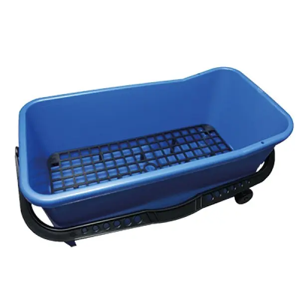 Obdélníkový kbelík o objemu 16 litrů je vybaven mřížkou a kolečky, což usnadňuje manipulaci a efektivní vymývání mopů při úklidu.