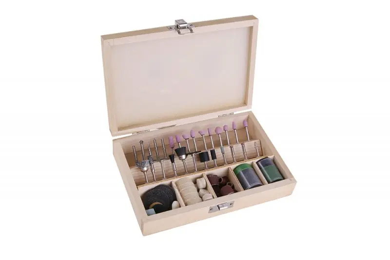 Tato sada obsahuje 100 různých nástavců určených pro přímé brusky, které jsou vhodné pro práci se dřevem. Nástavce jsou navrženy tak, aby pokryly široké spektrum úprav, od hrubého broušení až po jemné dokončovací práce. Díky rozmanitosti tvarů a zrnitostí je možné snadno přizpůsobit nástavec konkrétnímu úkolu.