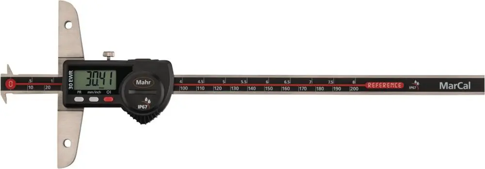 Digitální posuvný hloubkoměr MAHR s délkou měření 300 mm je určen pro přesné určování hloubky otvorů, drážek nebo vybrání v různých materiálech. Přístroj je vybaven čitelným digitálním displejem, který zobrazuje naměřené hodnoty v reálném čase a usnadňuje odečítání výsledků bez nutnosti převodu jednotek.