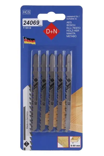Tato sada obsahuje pět kusů přímočarých pilových plátků s délkou 75 mm a tloušťkou 1,45 mm. Plátky jsou vyrobeny z uhlíkové oceli (HCS), což je materiál běžně používaný pro řezání měkkého dřeva, dřevotřísky nebo plastů. Díky standardizovaným rozměrům jsou vhodné pro většinu běžných přímočarých pil.